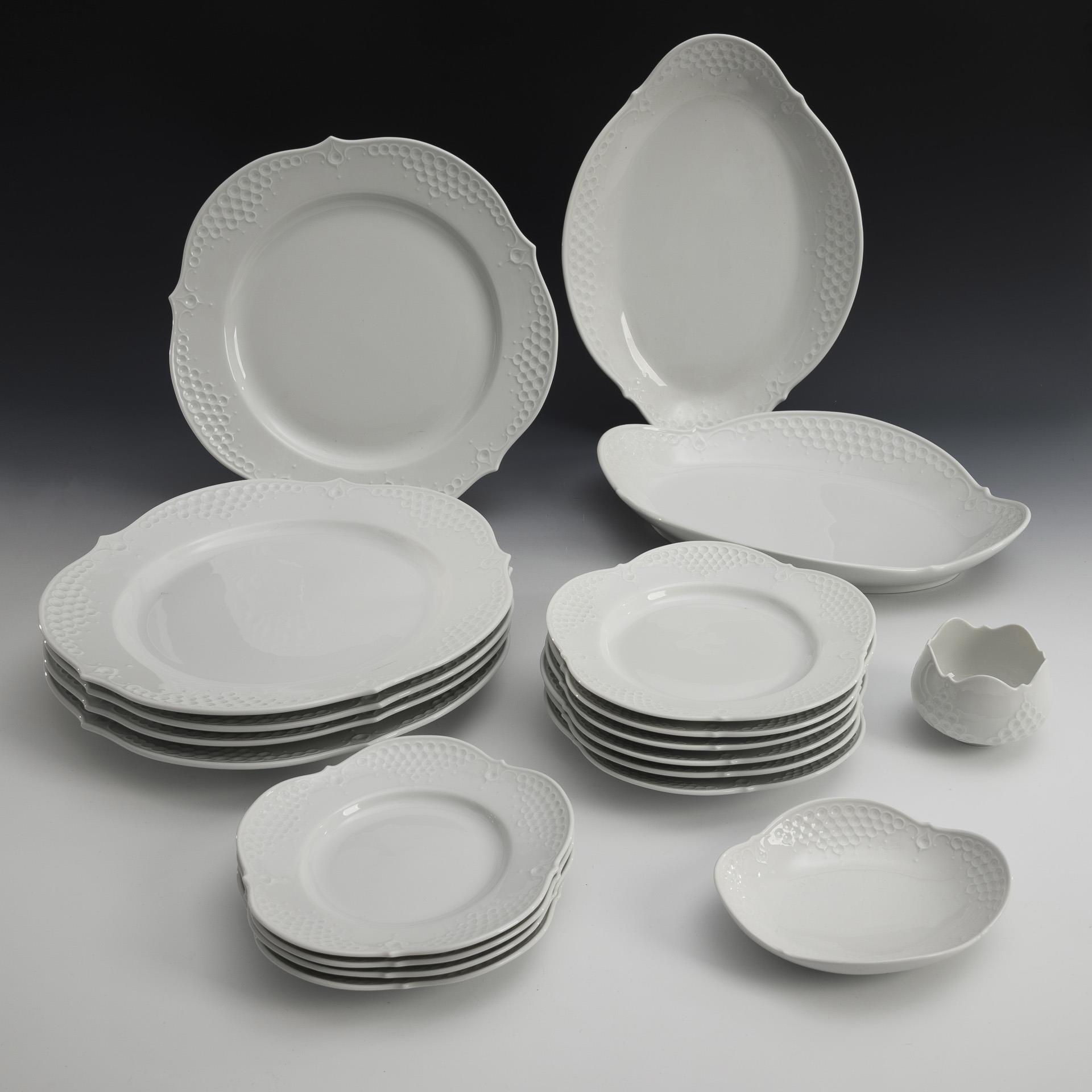 5 Platzteller (Ø 32,5 cm), 6 Brotteller (Ø 21,5 cm), 4 Beilagenteller (Ø 19 cm), 2 Ovalschalen (L 37,5 cm), 1 Ovalschälchen (L 16,5 cm) und 1 Zuckerschale (Ø 9 cm). Teils mit alten Etiketten und Filzstiftbeschriftung.