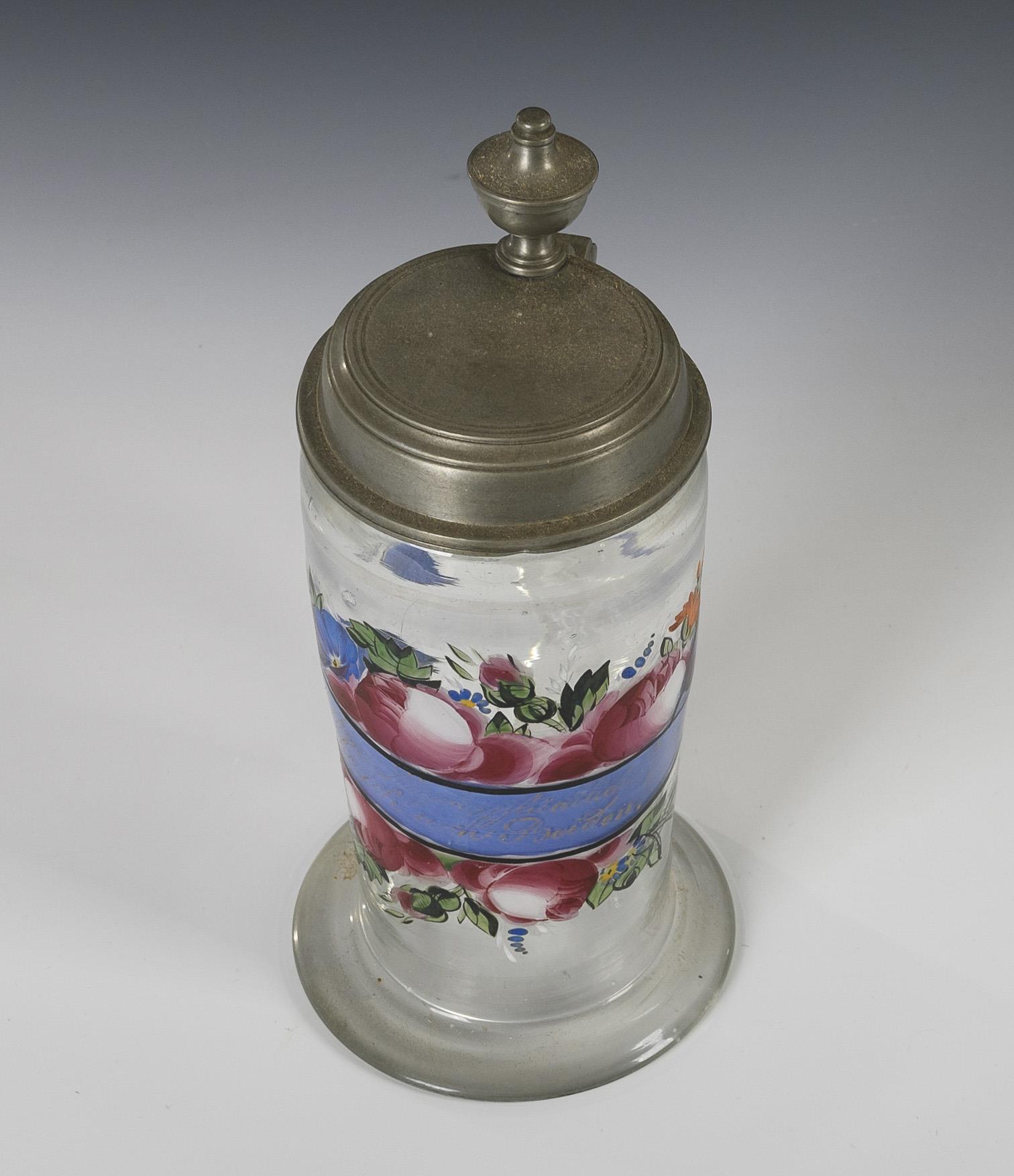 Walzenkrug mit ausgestelltem Stand, Bandhenkel und zinnmontiertem Scharnierdeckel. Schauseitig die Darstellung eines Blumenbuketts mit blauem Band, darauf die Bezeichung "Göttlichen Segen, glückliche Zeiten, wünsche ich euch Beiden."; Abriss. Gold berieben.