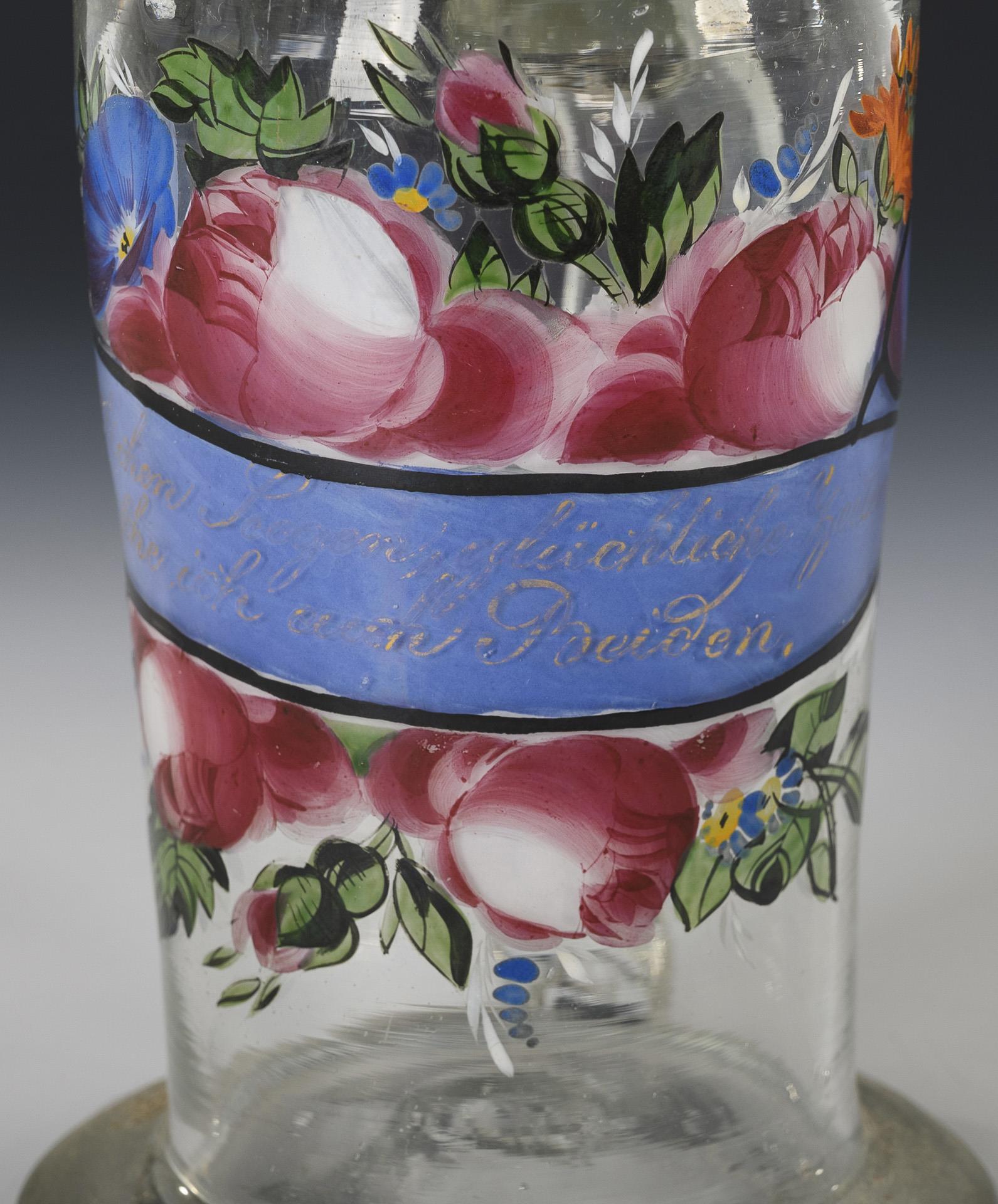 Farbloses Glas, polychrome Emailmalerei, Goldstaffage; Zinn. H 24 cm.