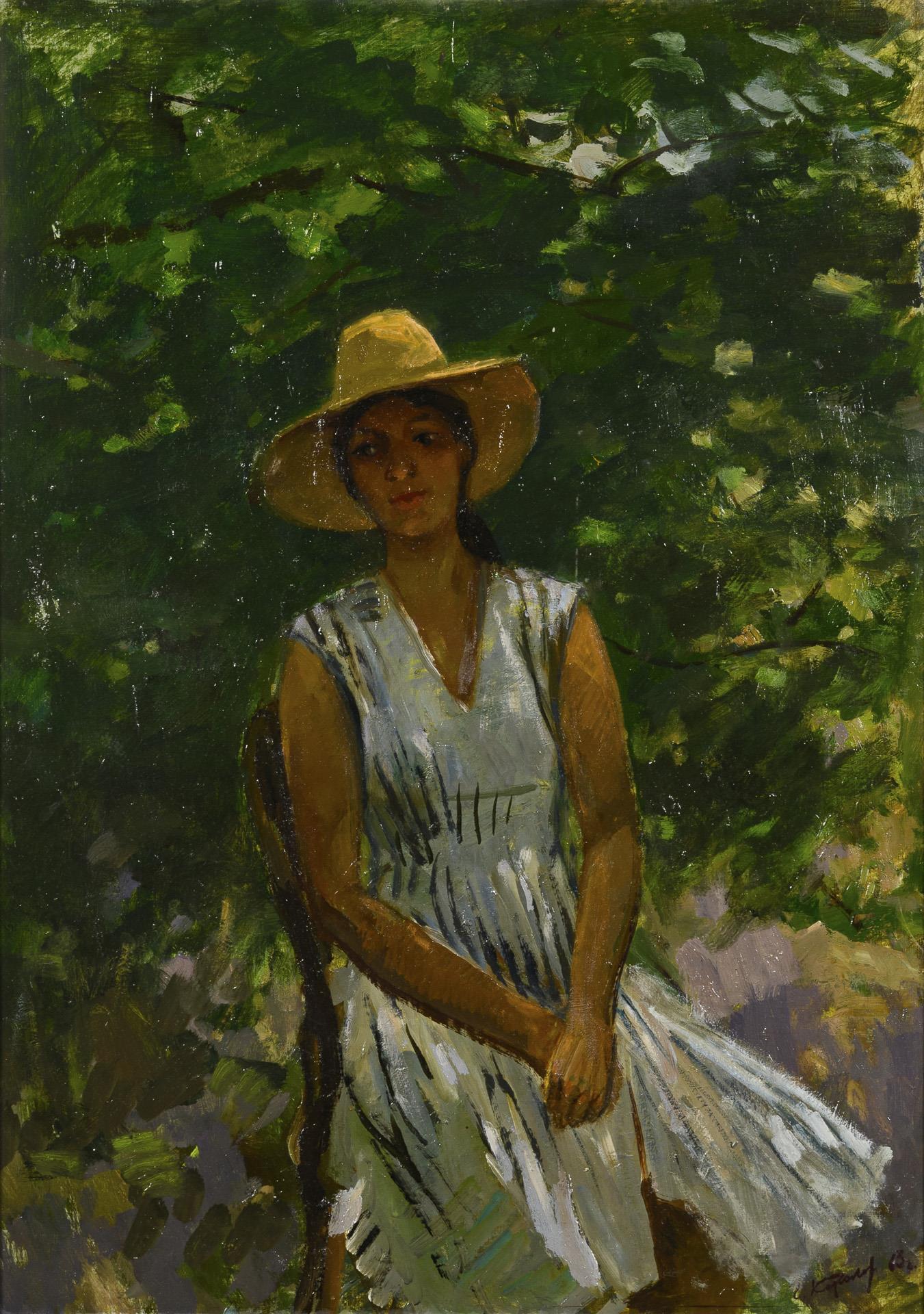 Porträt einer jungen Frau mit Sommerhut auf einem Stuhl an einem Baum. Leichte Altersspuren.
