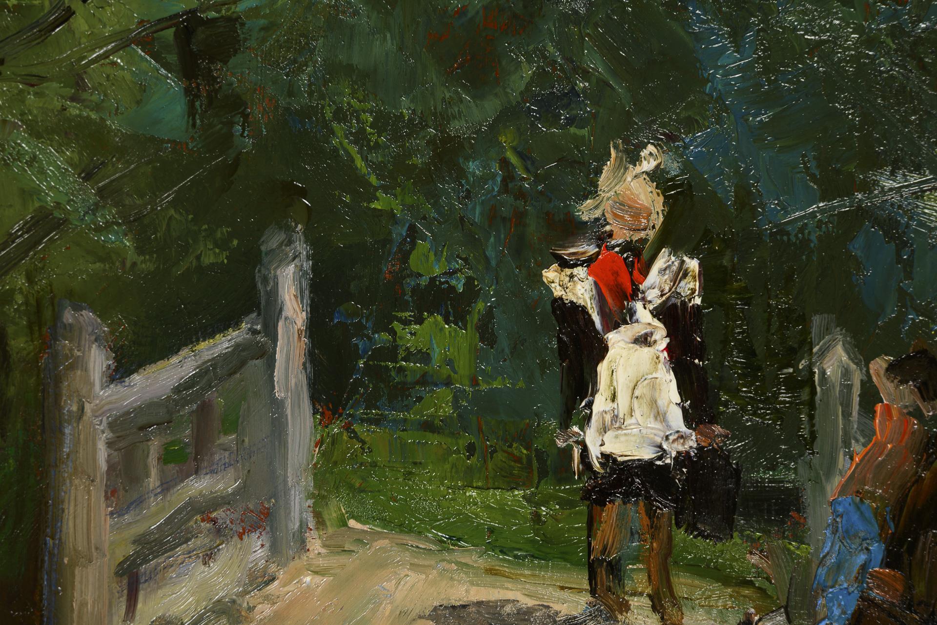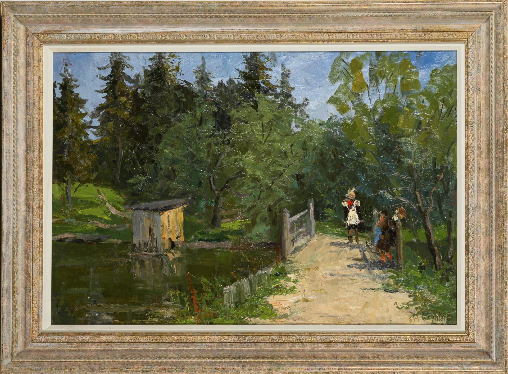 Sonnige Landschaft mit kleiner Brücke über dem Gewässer und Staffagefiguren auf der Straße.