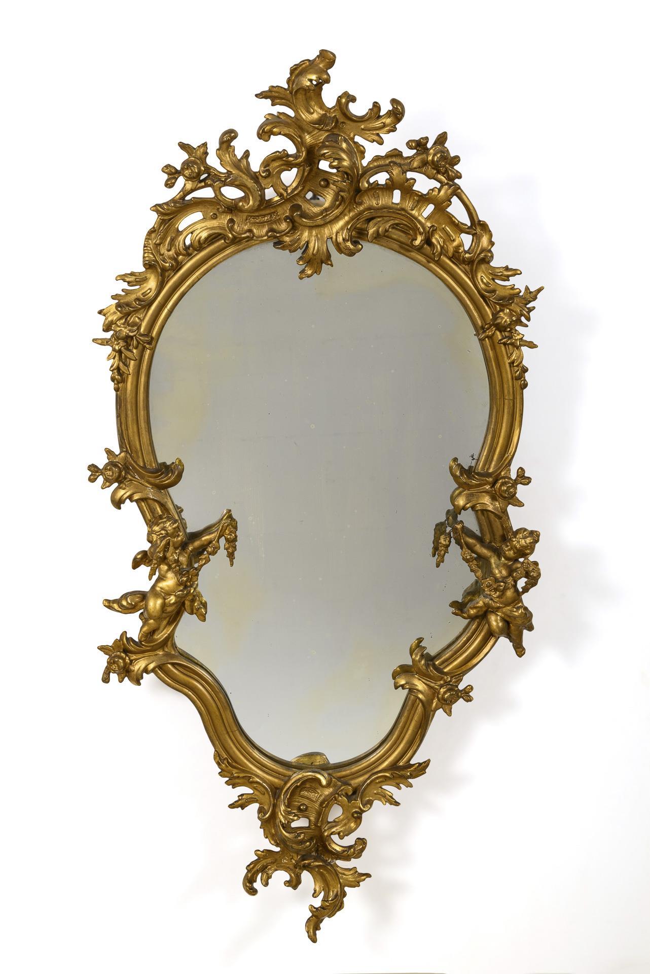 Geschweifter Wandspiegel mit teilplastischem Blattwerk, Rocaillen, Rosen und Putten. Mit Reparaturen und Defekten, teils geklebt, Spiegelglas mit Altersspuren.