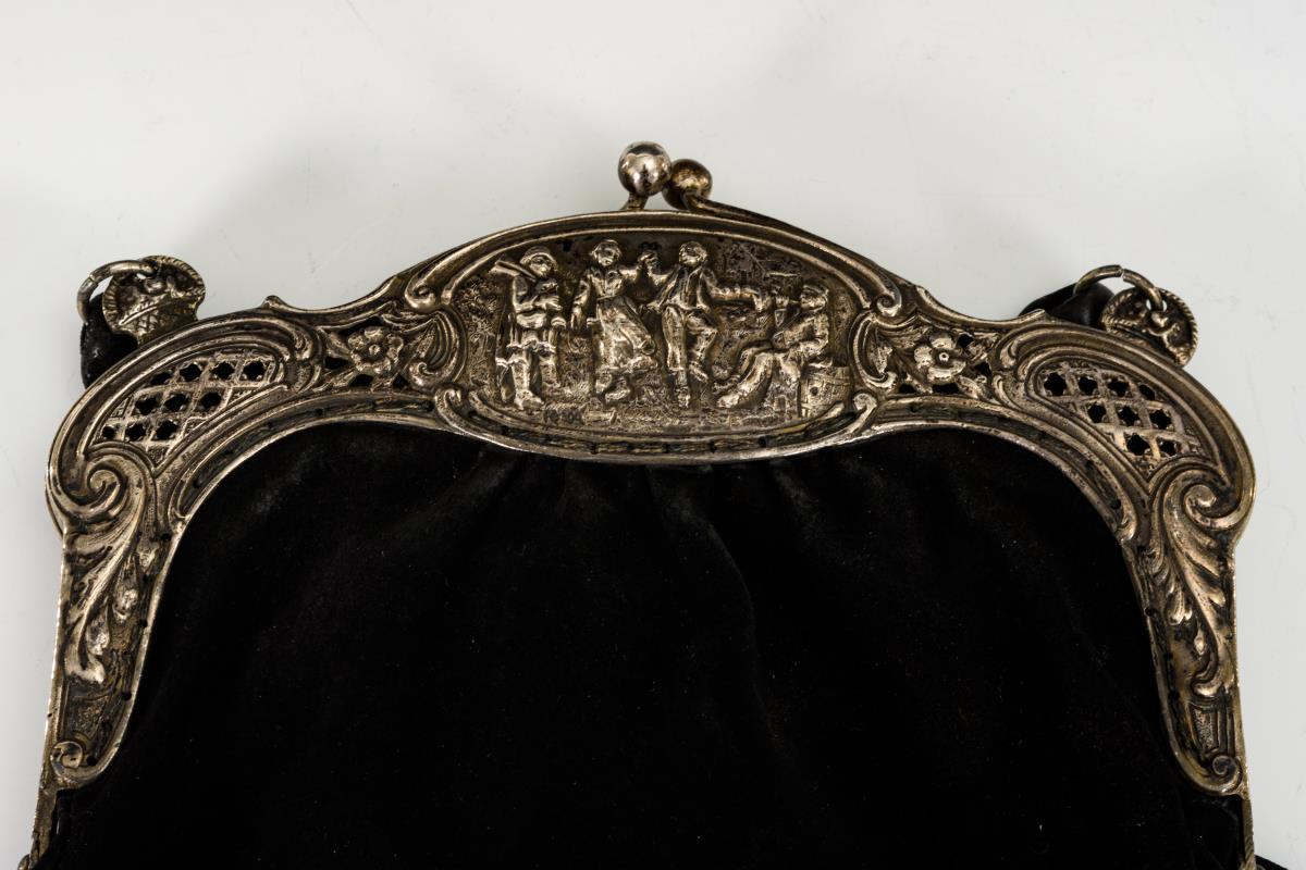 Silberbügel, schwarzes Wildleder, Perlstickerei. 19 x 18,5 cm /26,5 x 26,5 cm.