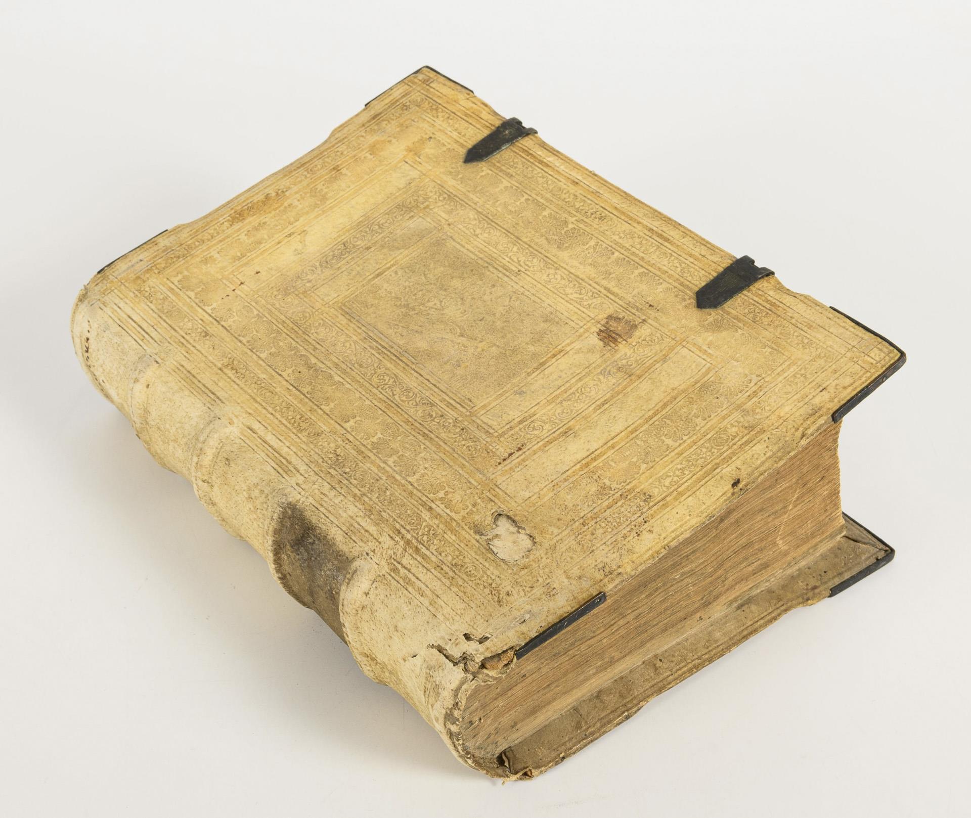 (23 inklusive Titelblatt), (8), 102, (8), 99, (8), 115, (8), 208, (12), 109, (14), 92, (12), 79, (8), 86, (18), 50, (5) Seiten. Mit diversen Titelseiten und Holzschnitt-Initialen. Im geprägten Ledereinband mit Metallecken. Zeitgemäße Altersspuren: Rücken etwas eingerissen, kleineres Loch im Ledereinband, ohne Schließen, leichter Wasserschaden auf den hinteren Seiten.