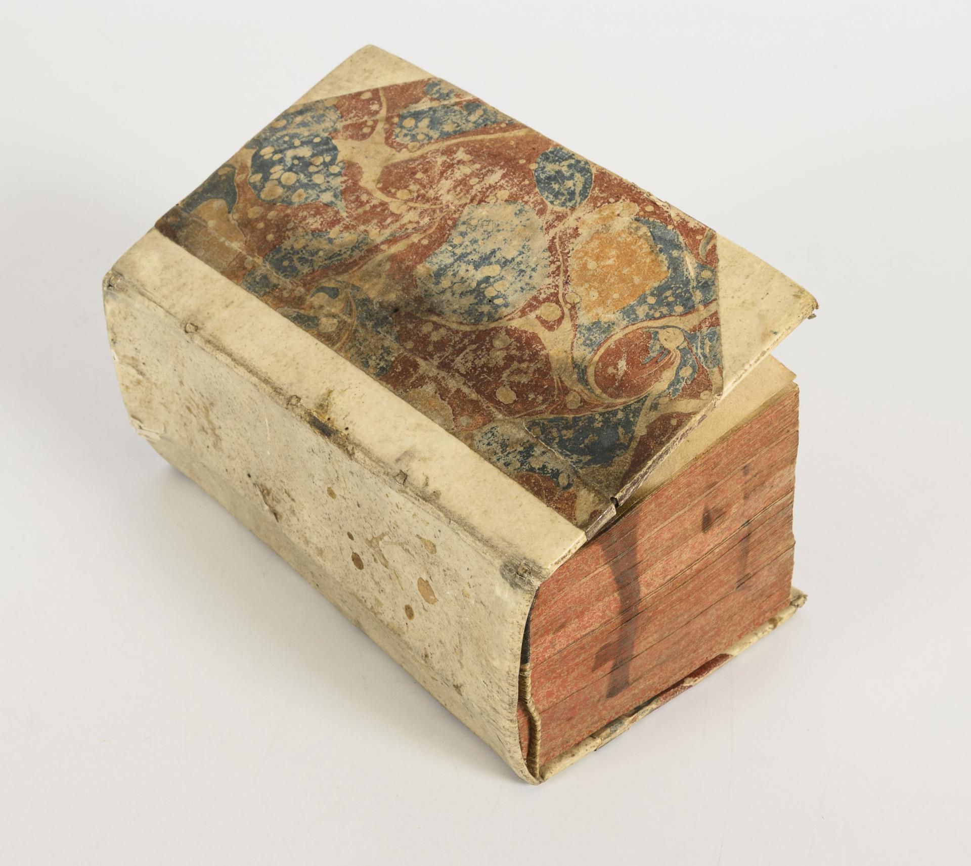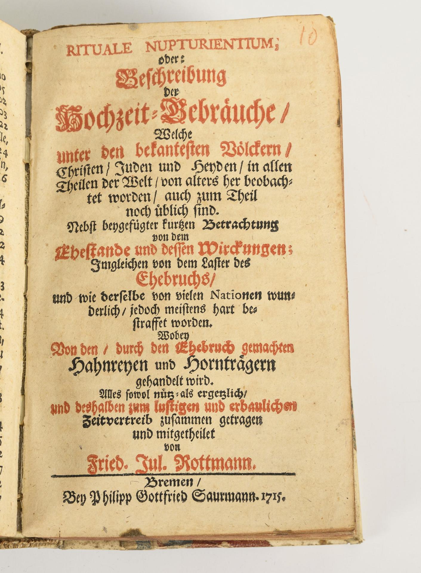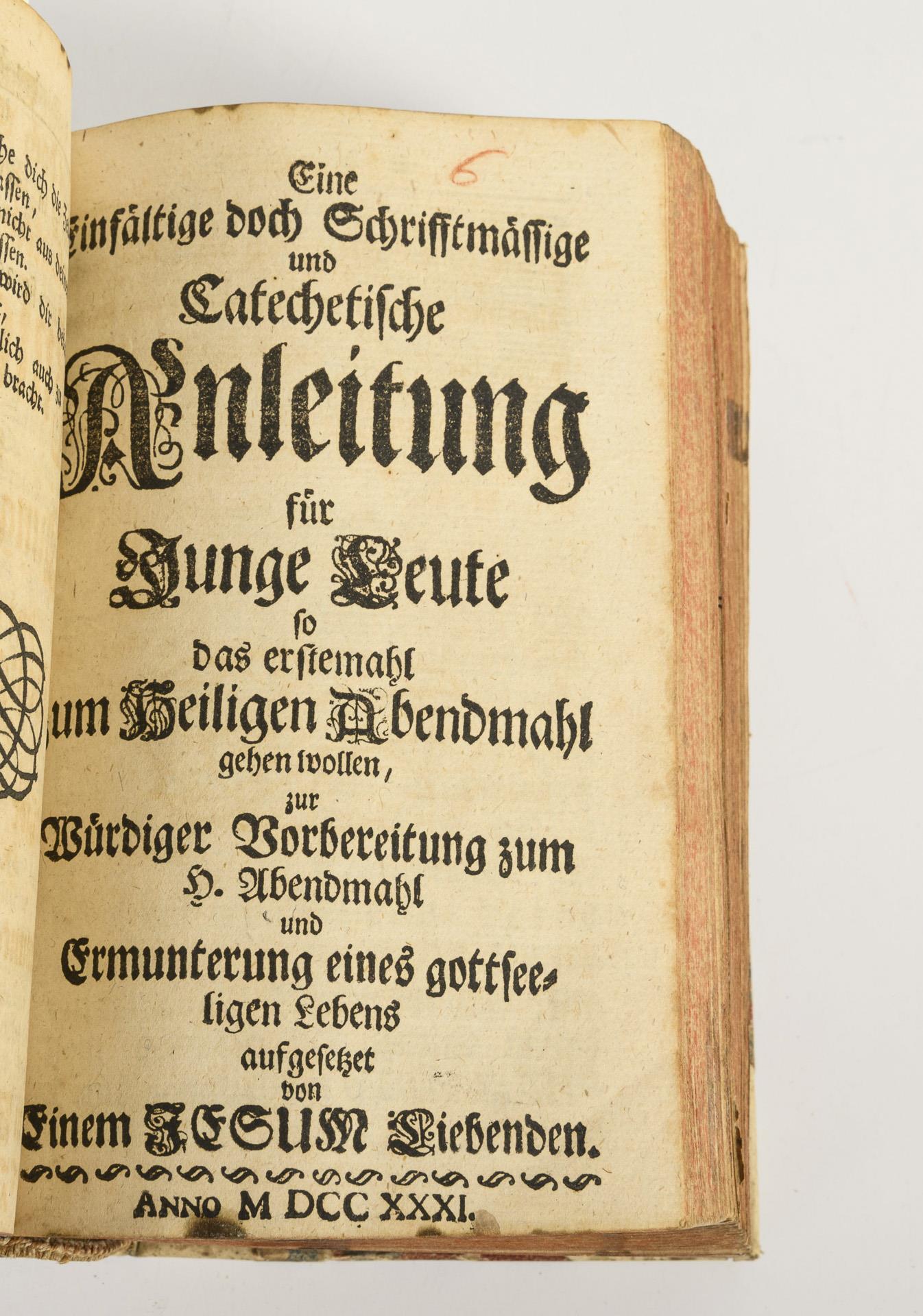 Buch mit 10 religiösen Titeln in deutscher Sprache. Mart. Nicol. Grinsio: "Ilias in nuce Oder Compendieuser Bericht ... augspurgischen Confeßion ...", Jena 1730, 102 Seiten.. / Georg Mich. Pfefferkorn: "Etlicher Lutheraner ... Gute Urtheile von Luthero ...", Gotha 1730, 95 Seiten. / Theophilo: "Mercks Pabstthum ... Prophezeyhungen von dem bevorstehenden Untergange des Pabstthums ...", Franckfurth und Freyburg 1730, 16 Seiten. / Joh. Conrad Schröter: "... Das die Seele nicht Materiell, sondern ein Geistiges Wesen sey ...", Leipzig 1729, 127 Seiten. / "Kurtz-gefaste Zergliederte Kirchen-Historie in Frag und Antwort ...", Zittau 1730, 80 Seiten. / "... Catechetische Anleitung für Junge Leute ...", 1731, 144 Seiten. / Johann Jacob Rambach: "Der wohl informierte Katechet ...", Jena 1722, 96 Seiten. / Joh. Matthaeo Gothen: "Curieuse Gedancken Von Glücke der Menschen (sic)", Stolberg 1730, 215 Seiten. / "... Lebens-Lauffe ... August Hermann Franckens ...", Büdingen 1728, 64 Seiten. / Fried. Jul. Rottmann: "Rituale Nupturientum; oder Beschreibung der Hochzeit-Gebräuche, Welche unter den bekantesten Völckern ... Ehebruchs ...", Bremen 1715, 450 Seiten und Register (22 Seiten). Im Halbpergamenteinband der Zeit, mit Rotschnitt, im Deckel handschriftliches Verzeichnis.