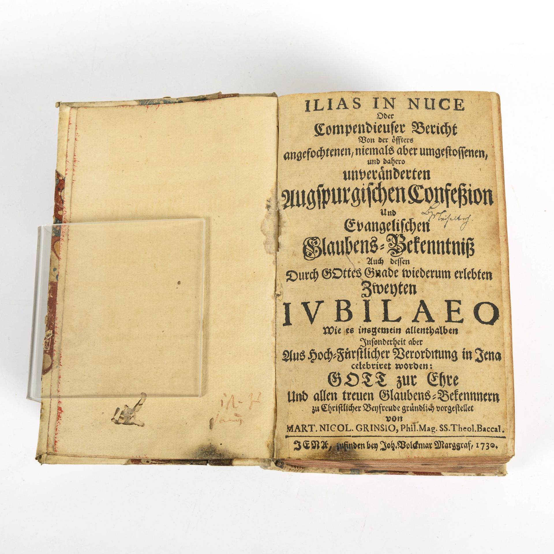 Buch mit 10 religiösen Titeln in deutscher Sprache. Mart. Nicol. Grinsio: "Ilias in nuce Oder Compendieuser Bericht ... augspurgischen Confeßion ...", Jena 1730, 102 Seiten.. / Georg Mich. Pfefferkorn: "Etlicher Lutheraner ... Gute Urtheile von Luthero ...", Gotha 1730, 95 Seiten. / Theophilo: "Mercks Pabstthum ... Prophezeyhungen von dem bevorstehenden Untergange des Pabstthums ...", Franckfurth und Freyburg 1730, 16 Seiten. / Joh. Conrad Schröter: "... Das die Seele nicht Materiell, sondern ein Geistiges Wesen sey ...", Leipzig 1729, 127 Seiten. / "Kurtz-gefaste Zergliederte Kirchen-Historie in Frag und Antwort ...", Zittau 1730, 80 Seiten. / "... Catechetische Anleitung für Junge Leute ...", 1731, 144 Seiten. / Johann Jacob Rambach: "Der wohl informierte Katechet ...", Jena 1722, 96 Seiten. / Joh. Matthaeo Gothen: "Curieuse Gedancken Von Glücke der Menschen (sic)", Stolberg 1730, 215 Seiten. / "... Lebens-Lauffe ... August Hermann Franckens ...", Büdingen 1728, 64 Seiten. / Fried. Jul. Rottmann: "Rituale Nupturientum; oder Beschreibung der Hochzeit-Gebräuche, Welche unter den bekantesten Völckern ... Ehebruchs ...", Bremen 1715, 450 Seiten und Register (22 Seiten). Im Halbpergamenteinband der Zeit, mit Rotschnitt, im Deckel handschriftliches Verzeichnis.
