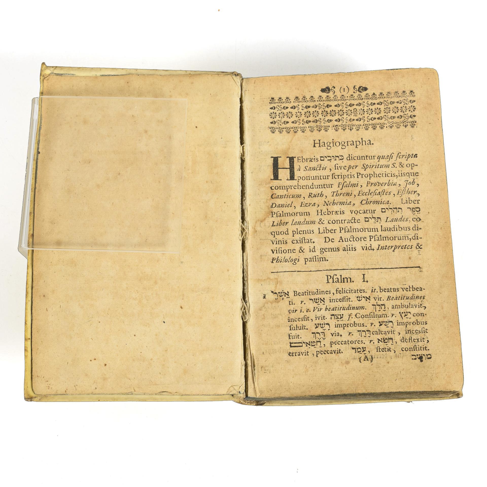 Ohne Titelblatt, 632, 81, (33) Seiten. Text zweisprachig in Latein und Hebräisch, zum Spracherwerb und für vergleichende Studien. Im Pergamenteinband. Alters- und Gebrauchsspuren, Pergament fehlt auf der Rückseite teilweise, sonst altersgemäß guter Zustand.