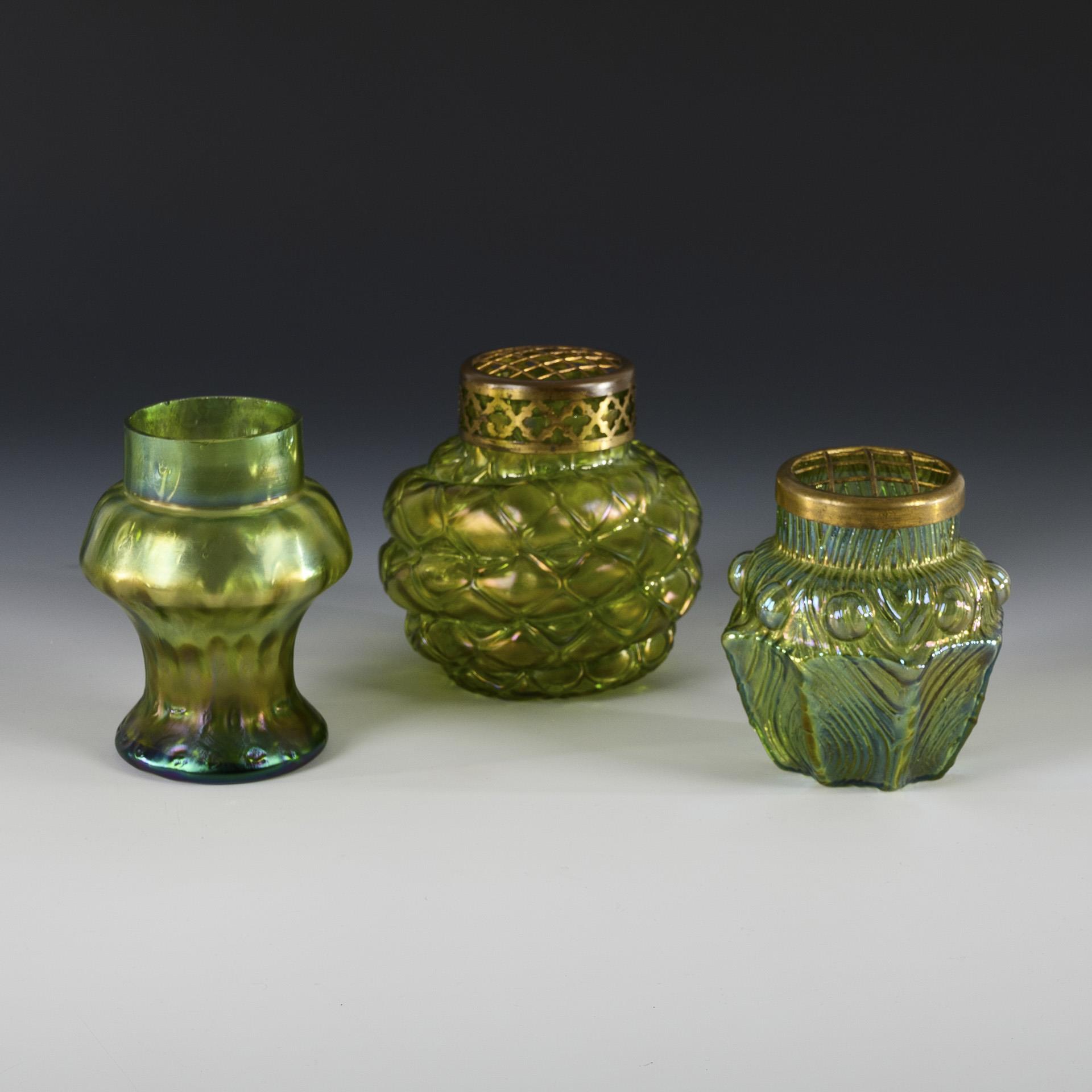 1x LÖTZ, "Rusticana": konkave Vase mit ausgestellter Schulter und zylindrischem Hals; ohne Metallaufsatz (H 13 cm). / 1x oktogonale formgeblasene Vase mit Aststruktur und Metallaufsatz (H 12 cm). / 1x vierfach gegliederte Vase mit Wabenstruktur, zylindrischem Hals und Metallaufsatz (H 12,5 cm).
