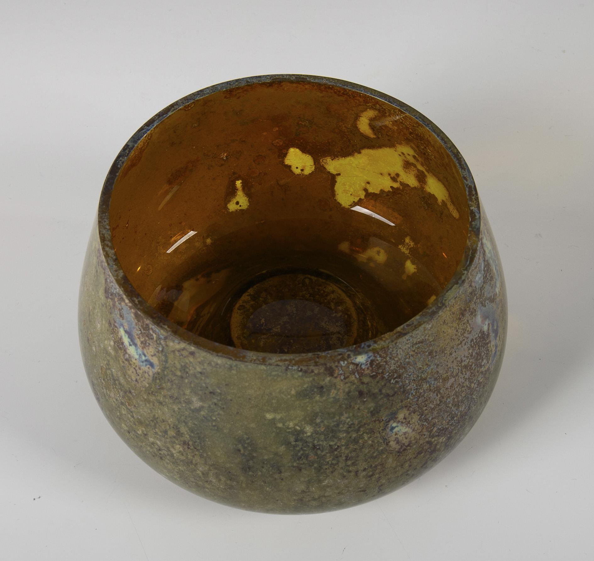 2x GLASFABRIK ELISABETH: Vase aus opakviolettem, irisiertem Glas mit Fadennetz (H 18 cm) und Vase aus farblosem, irisiertem Glas mit hellblauem, opalinem Innenfang und violettem Fadennetz (H 23,5 cm). / 1x Josef Knizek, GLASFABRIK ANTONIENHÜTTE, Ullersdorf/Teplitz: Schale aus farblosem Glas mit eingebrannten Silbersalz-Beizen, sogenanntes "Pandora-Glas" (H 9 cm, Ø 14 cm). / 1x Birnväschen aus hellgrünem, irisiertem Glas mit schauseitig emailgemalten, stilisierten Bäumen (signiert "W.G[?] 4/363; H 15 cm). 2 Vasen mit minimalen Randbestoßungen.
