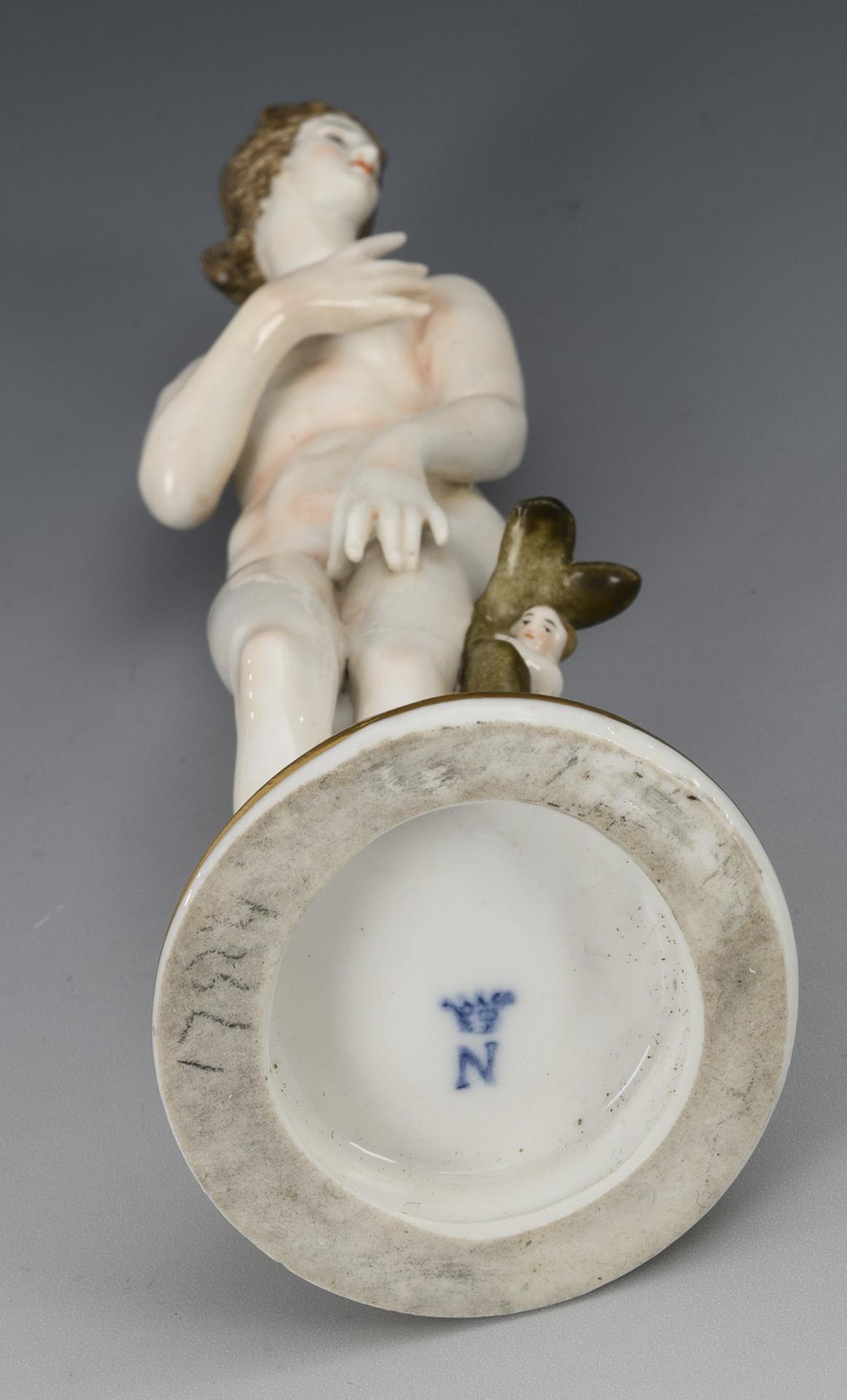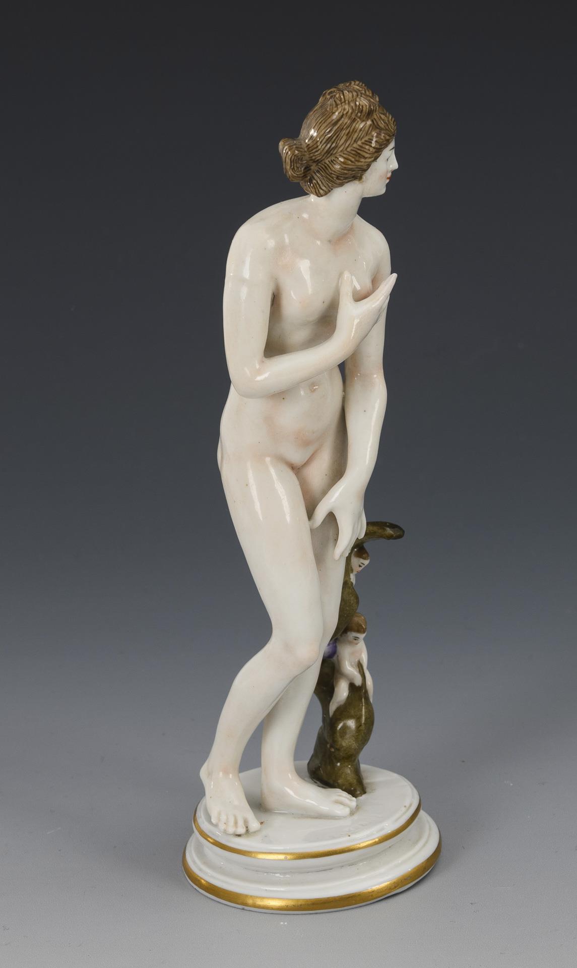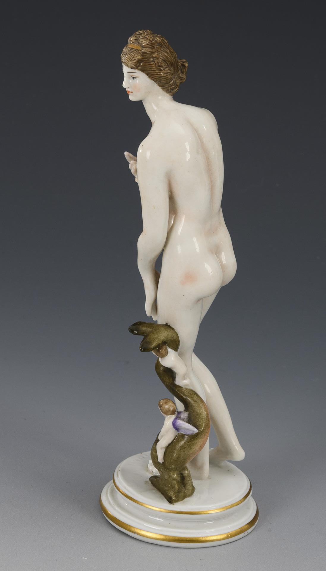 Auf einem Rundsockel an einem Delfin mit zwei Putten stehender Frauenakt. Rechte Hand restauriert.