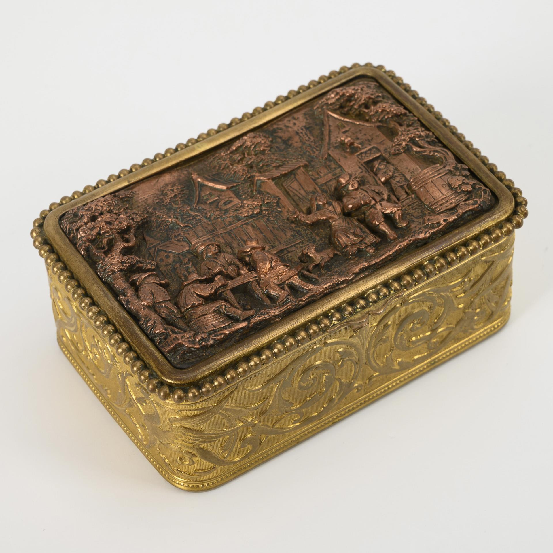 Quaderdose mit gerundeten Ecken, auf dem Scharnierdeckel Dorfszene mit zechenden und tanzenden Bauern, auf der Wandung umlaufendes Rankenornament mit Greifen.