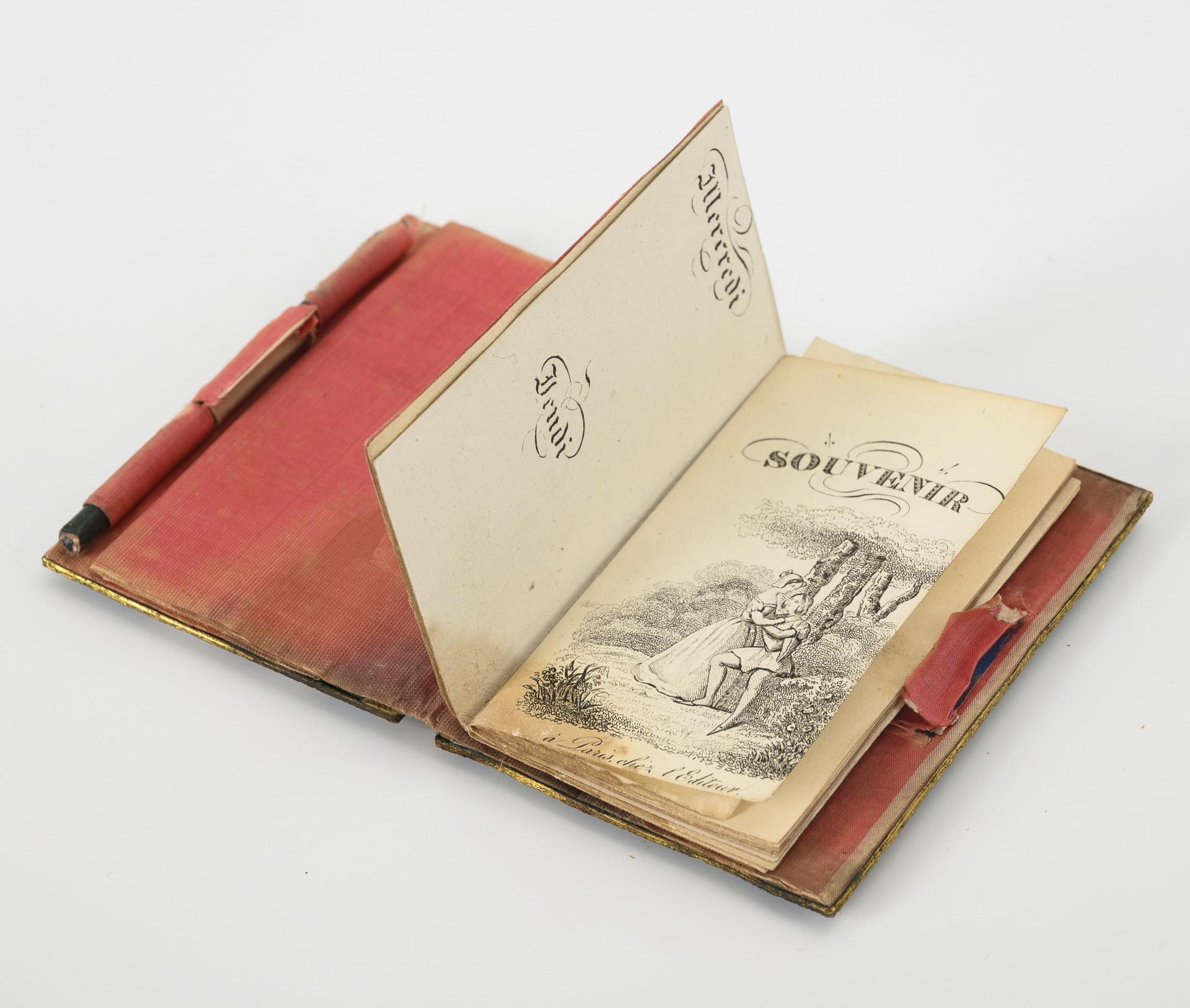 Tanzkarte beidseitig reich ornamental verziert. Innen roter Samt sowie Büchlein "Souvenir a Paris, chez l Editeur" ohne Einträge sowie eingelegter Zettel mit Handschrift "From Debby & Betty French on leaving them July 1849, Cuskinny ..." (Irland)