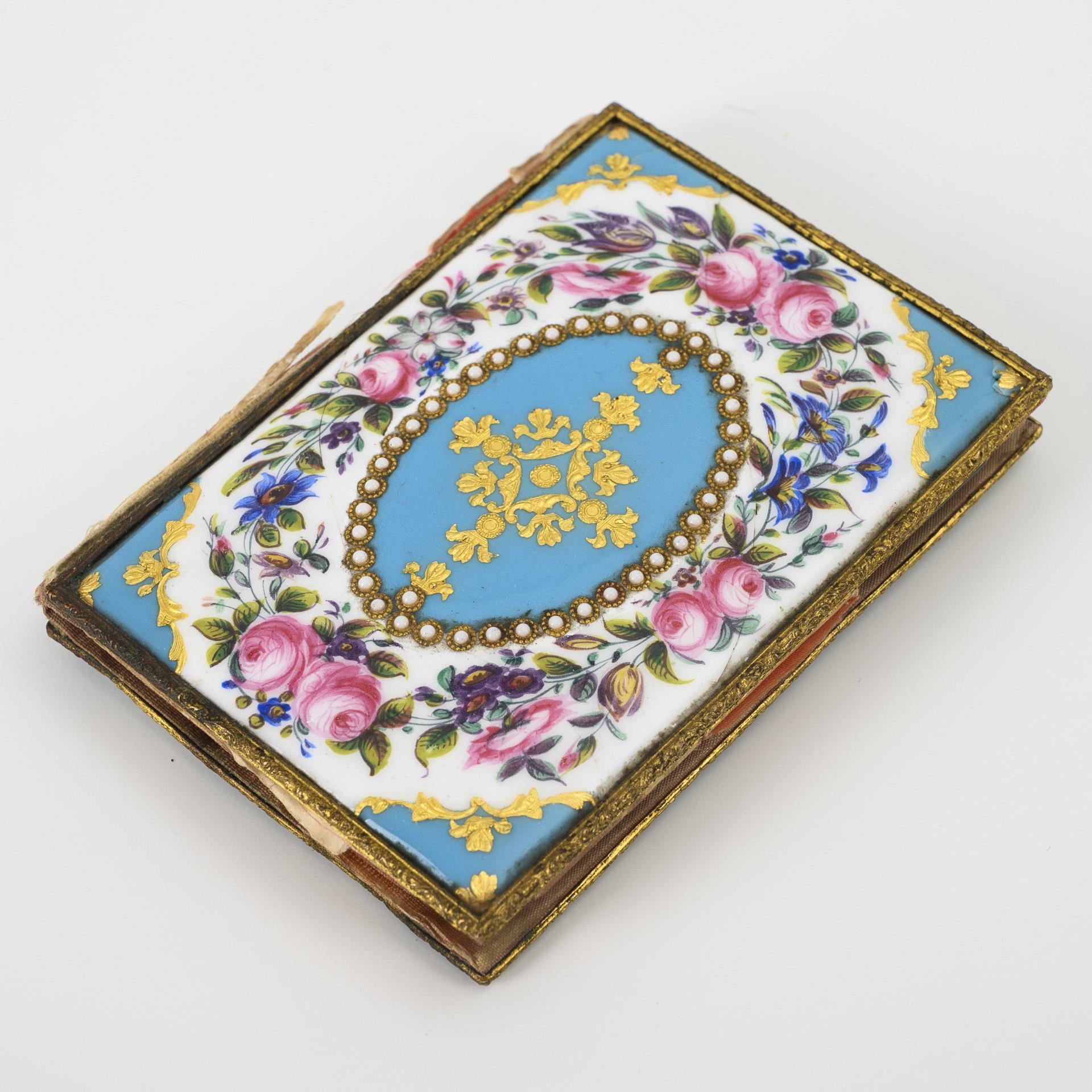 Wohl Kupfer, blaues und weißes opakes Email mit Emailmalerei, gold- bzw. silberfarbenem Ornament sowie applizierter Kranz aus Emailperlen. Goldfarbene Metallkanten. 8,5 x 6 cm (geschlossen).