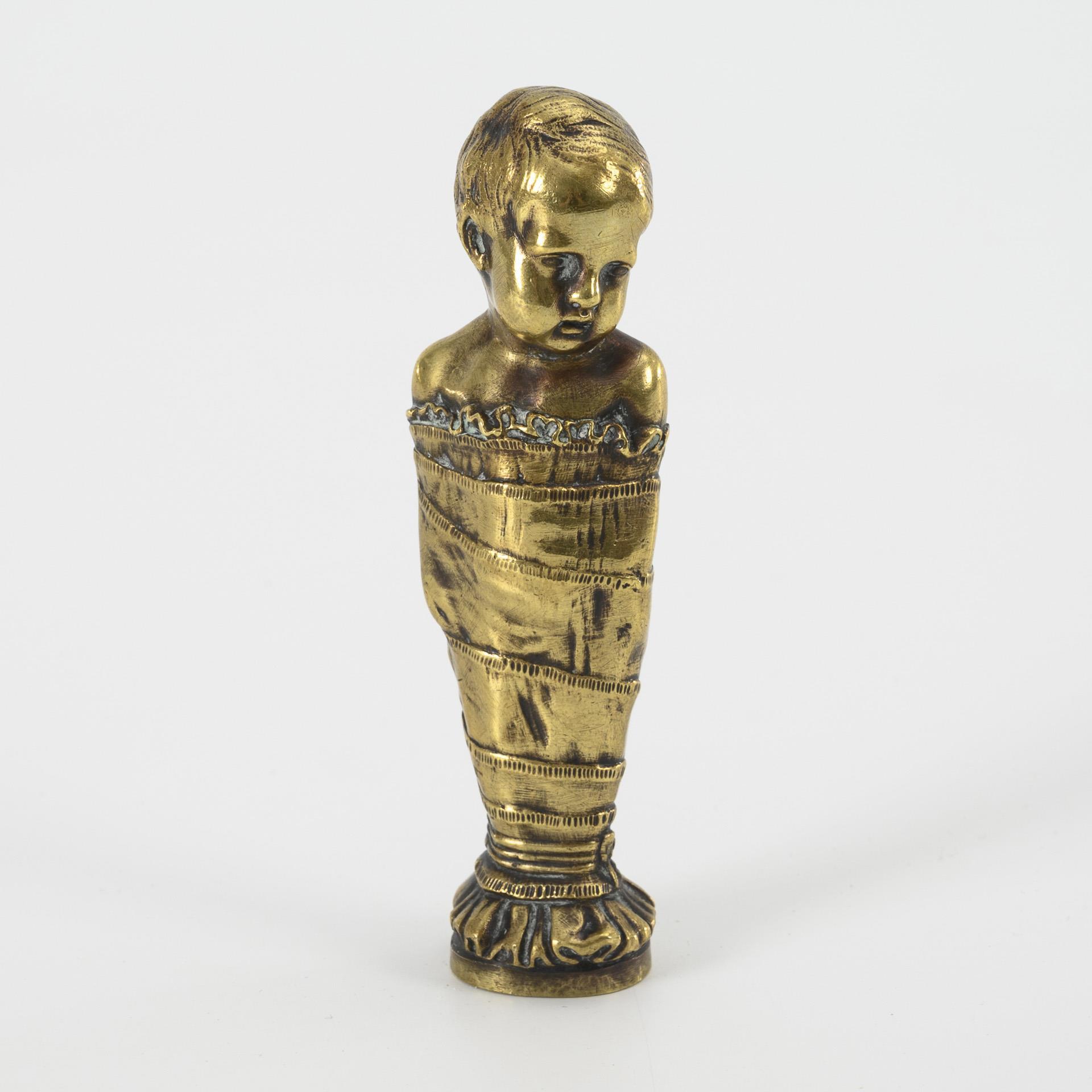 Stehendes Wickelkind mit zur Seite gewendetem Kopf; auf dem Typar graviertes Adelswappen.