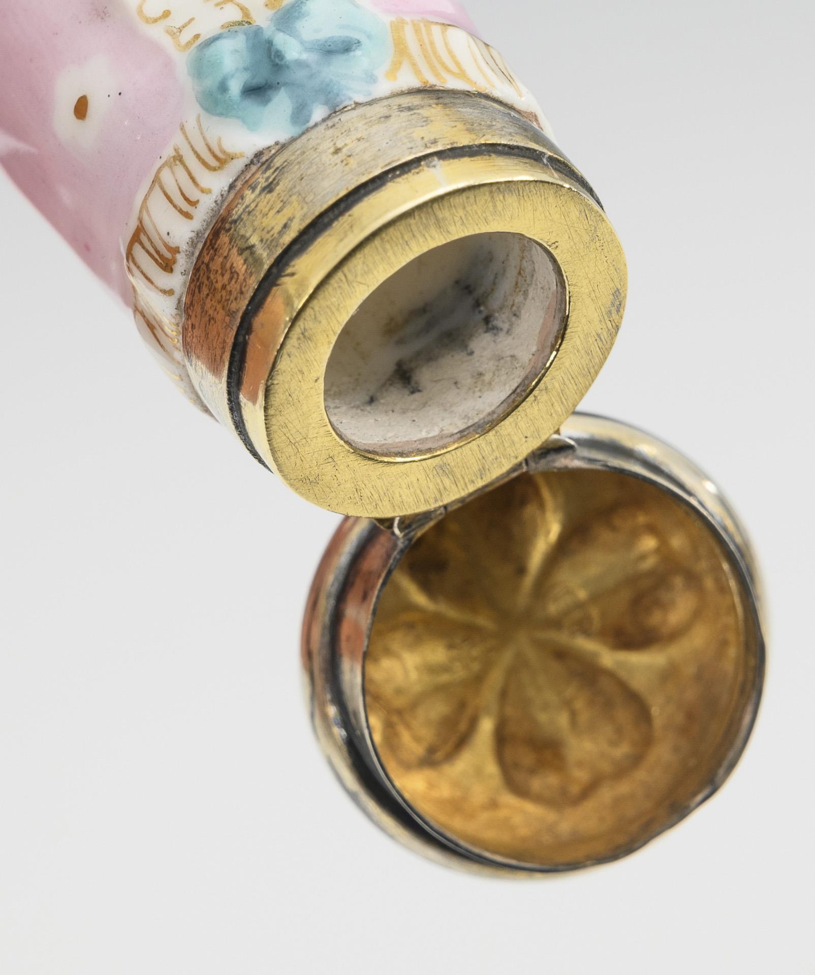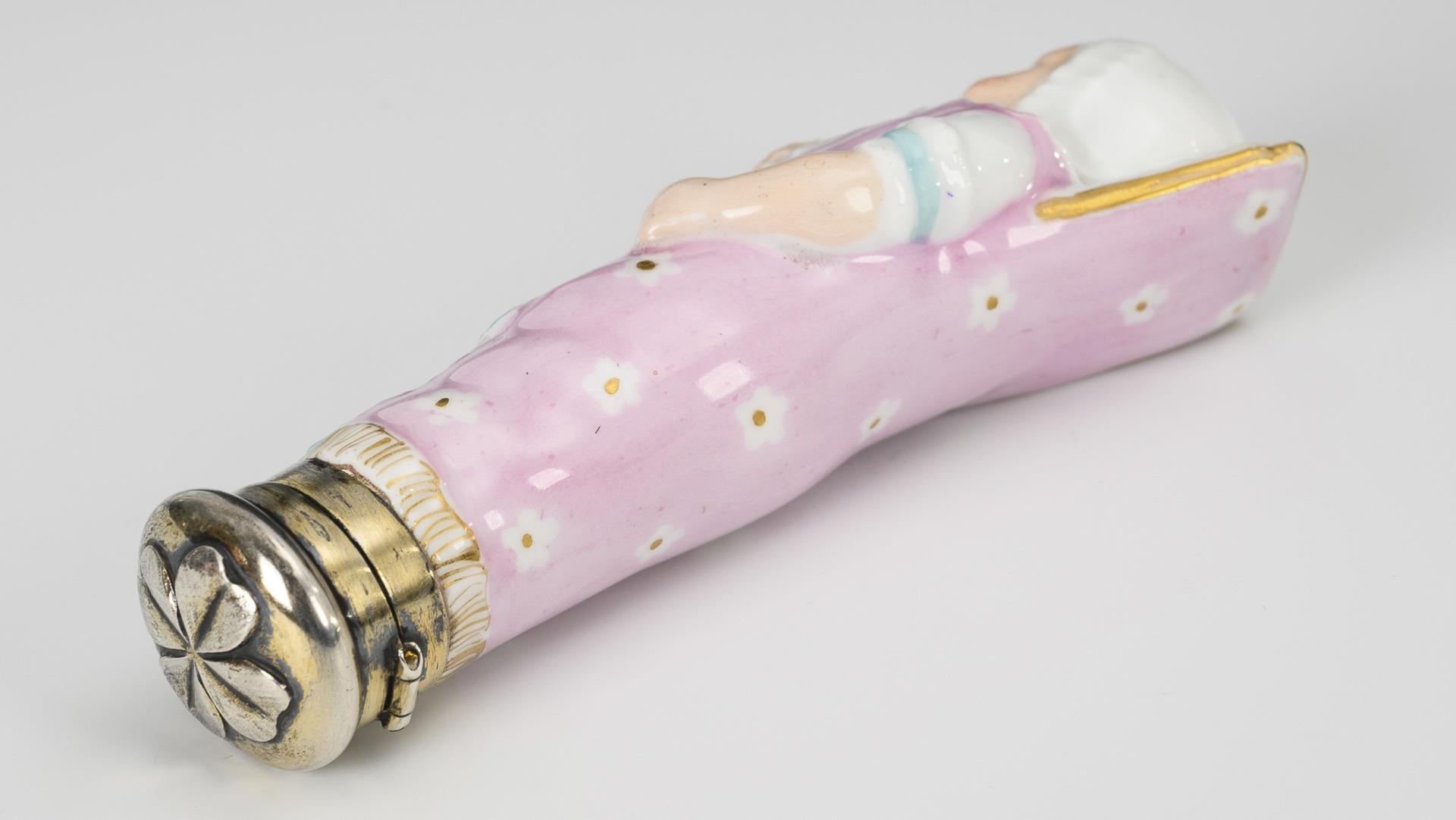 Polychrom bemalt, goldstaffiert; vergoldete Silbermontierung. L 10 cm.