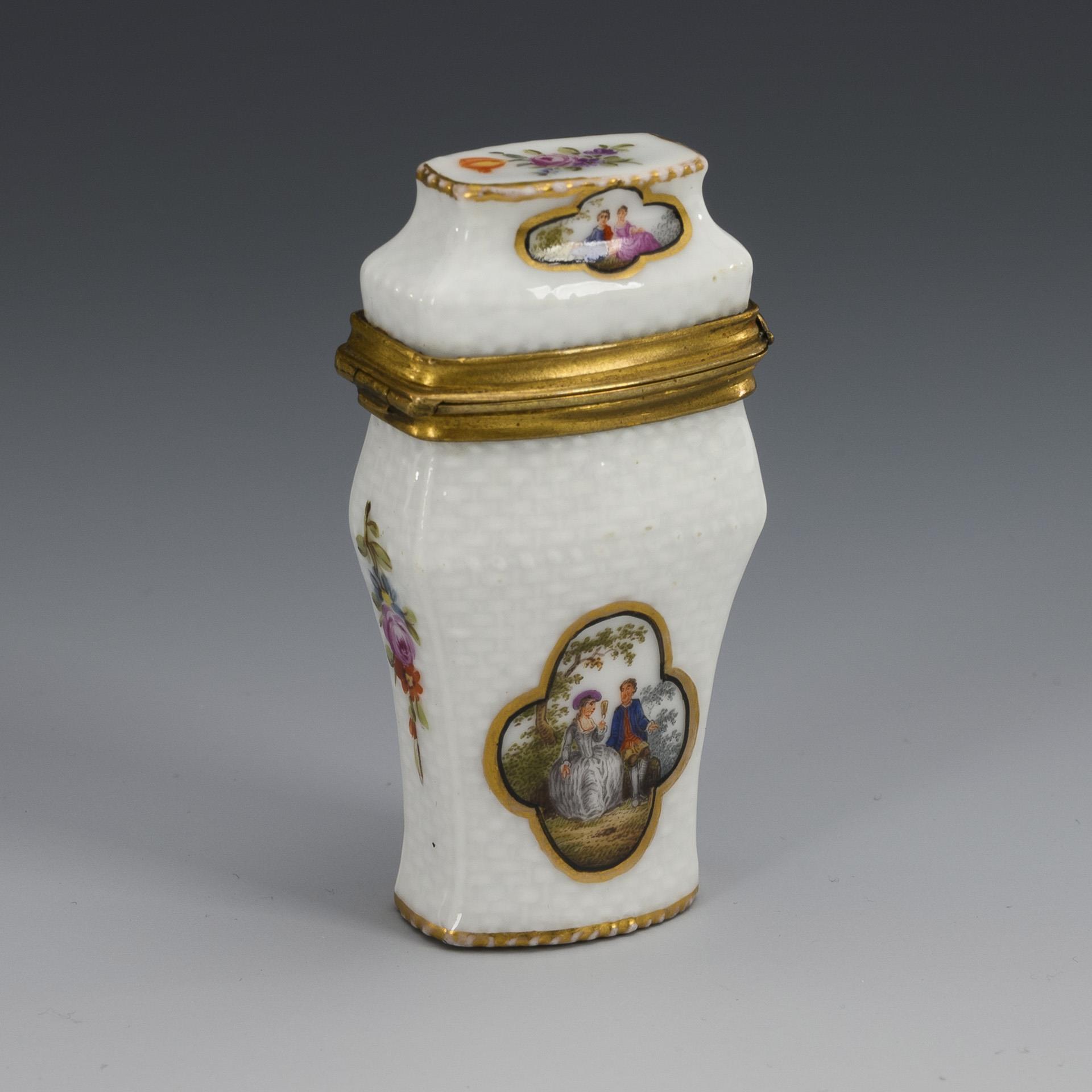 Vierkantige Balusterdose mit metallmontiertem Scharnierdeckel und Korbrelief. Auf Wandung und Deckel Vierpasskartuschen mit der Darstellung von galanten Paaren in einer Parklandschaft, an den Längsseiten Blumenmalerei. Minimaler Goldabrieb.