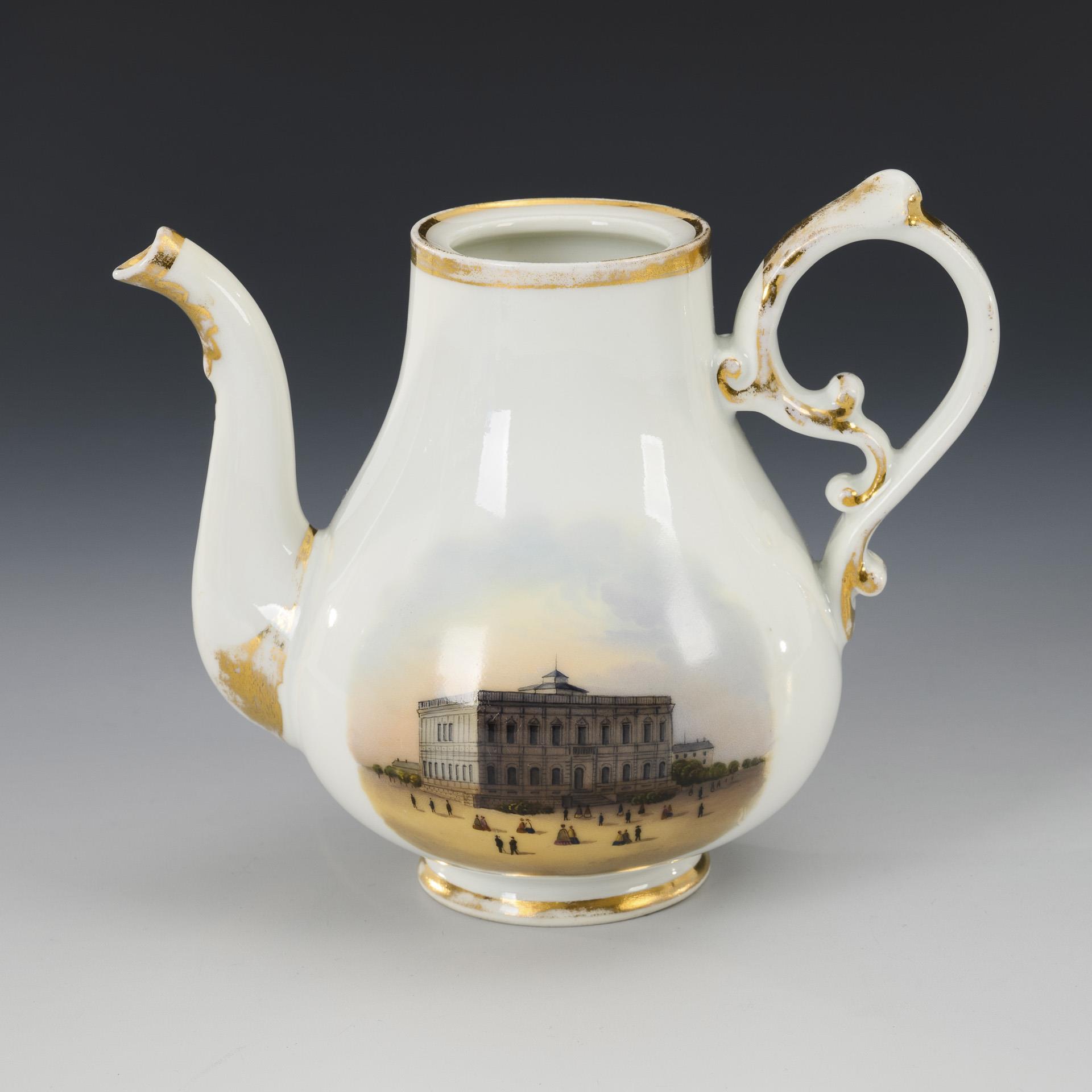Birnkanne mit Rocaillehenkel und Röhrenausguß. Auf der Wandung eine Ansicht des Neuen Theaters und des Neuen Museums in Leipzig. Ohne Deckel.