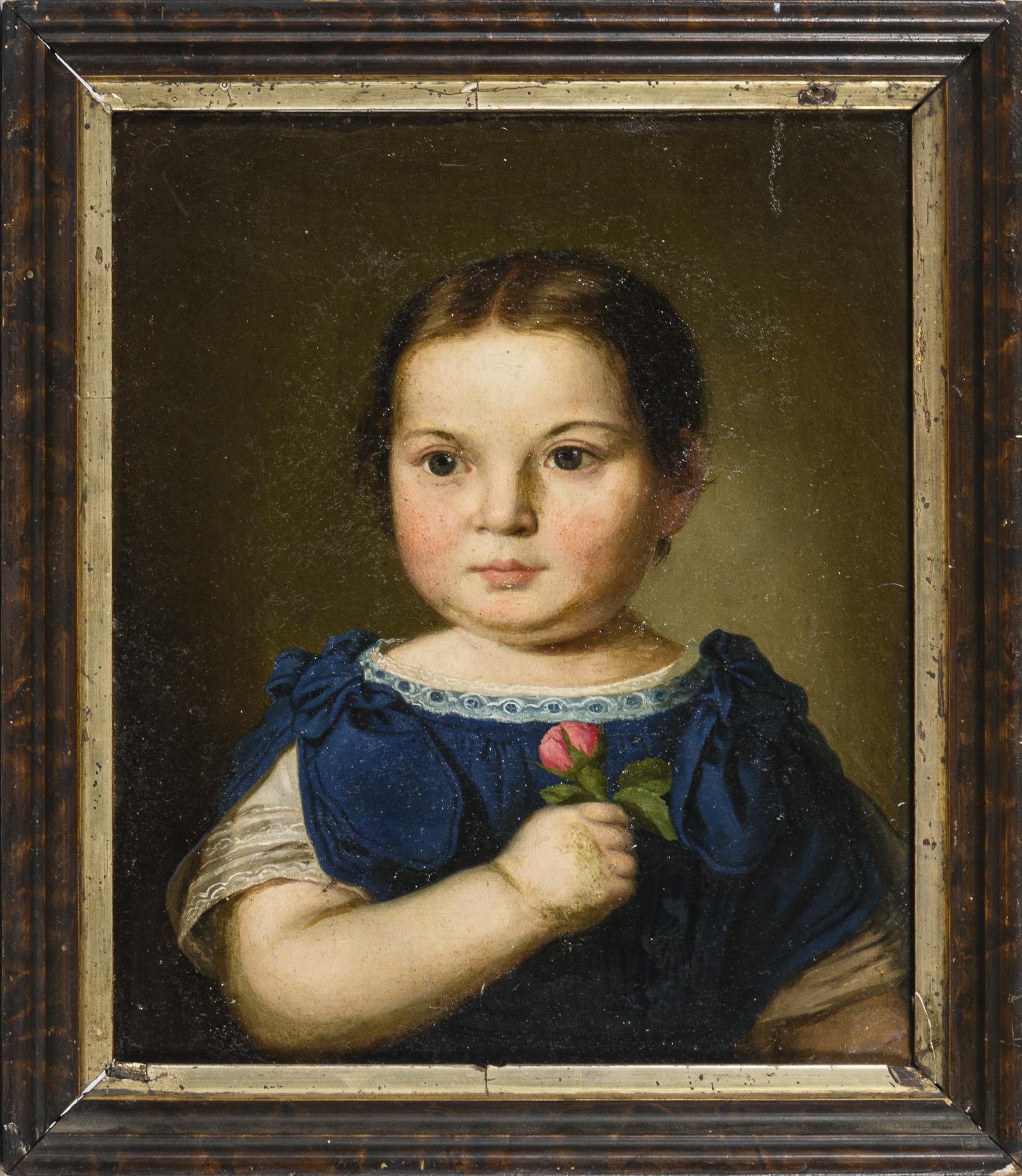 Porträt der Hedwig Günther (1853 - 1916) als Kind im blauen Kleid mit kleiner Rosenblüte in der Hand. Altersspuren.