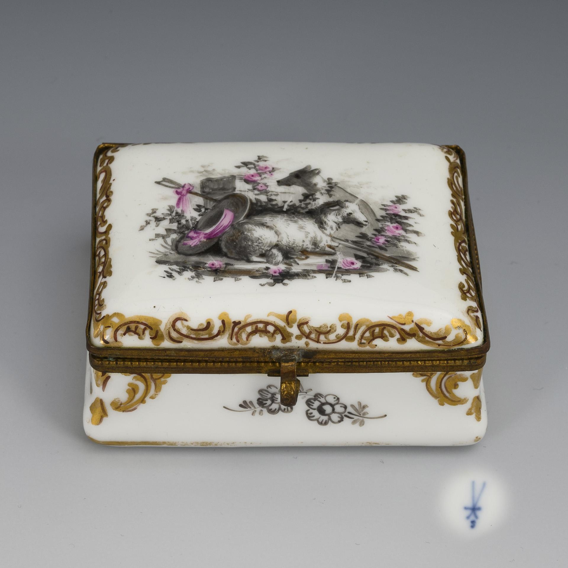 Rechteckige Dose mit metallmontiertem Scharnierdeckel. Auf dem Deckel die grisaillegemalte Darstellung eines Schafes mit Hund, Hut und Schäferstab, im Deckel zwei Pfeile in zwei Herzen, Tauben, Pfeil und Bogen. Partieller Goldabrieb.