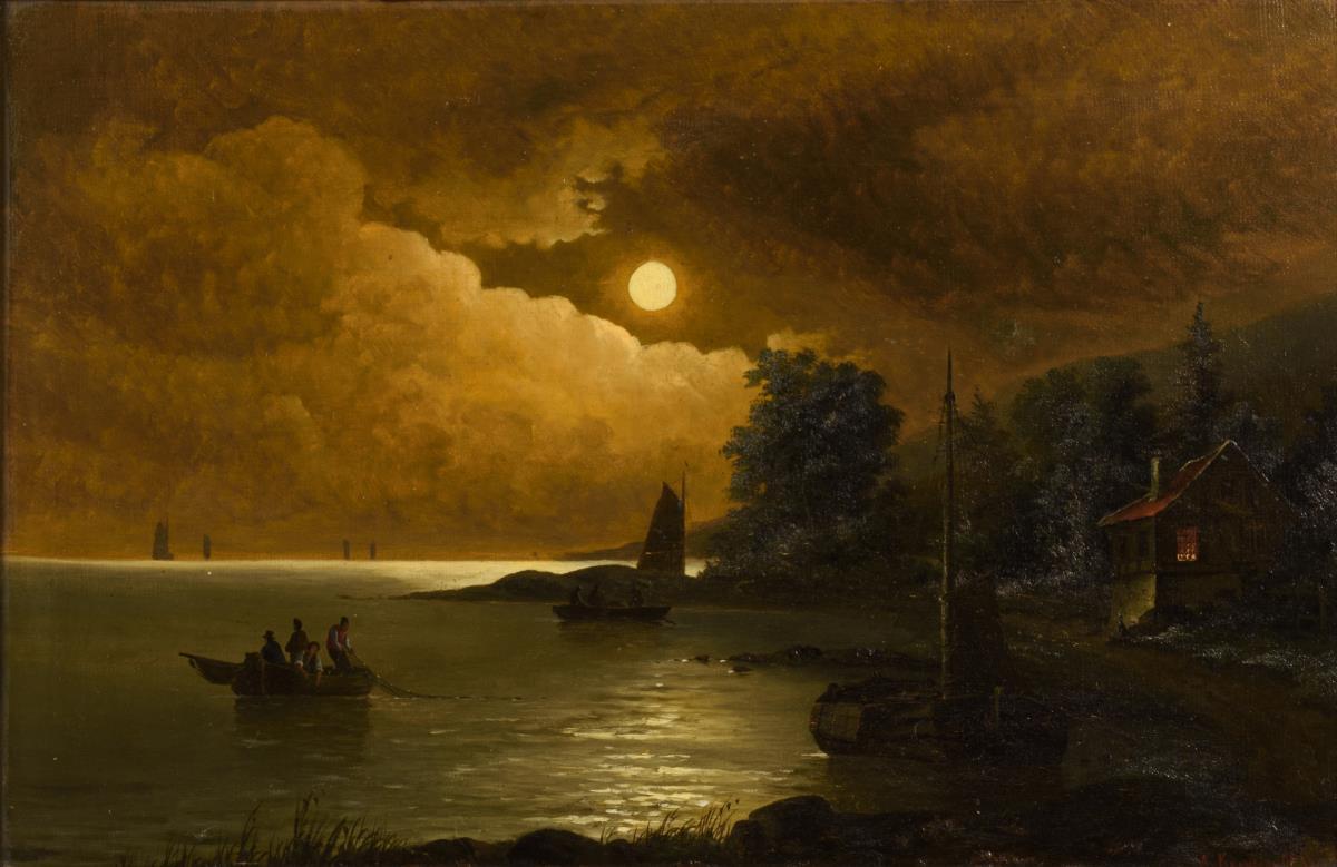 Vollmond über der Küste mit den Fischern auf dem Wasser nahe dem Strand und den Seglern weiter draußen. Eine kleine restaurierte Stelle mit Hinterklebung.