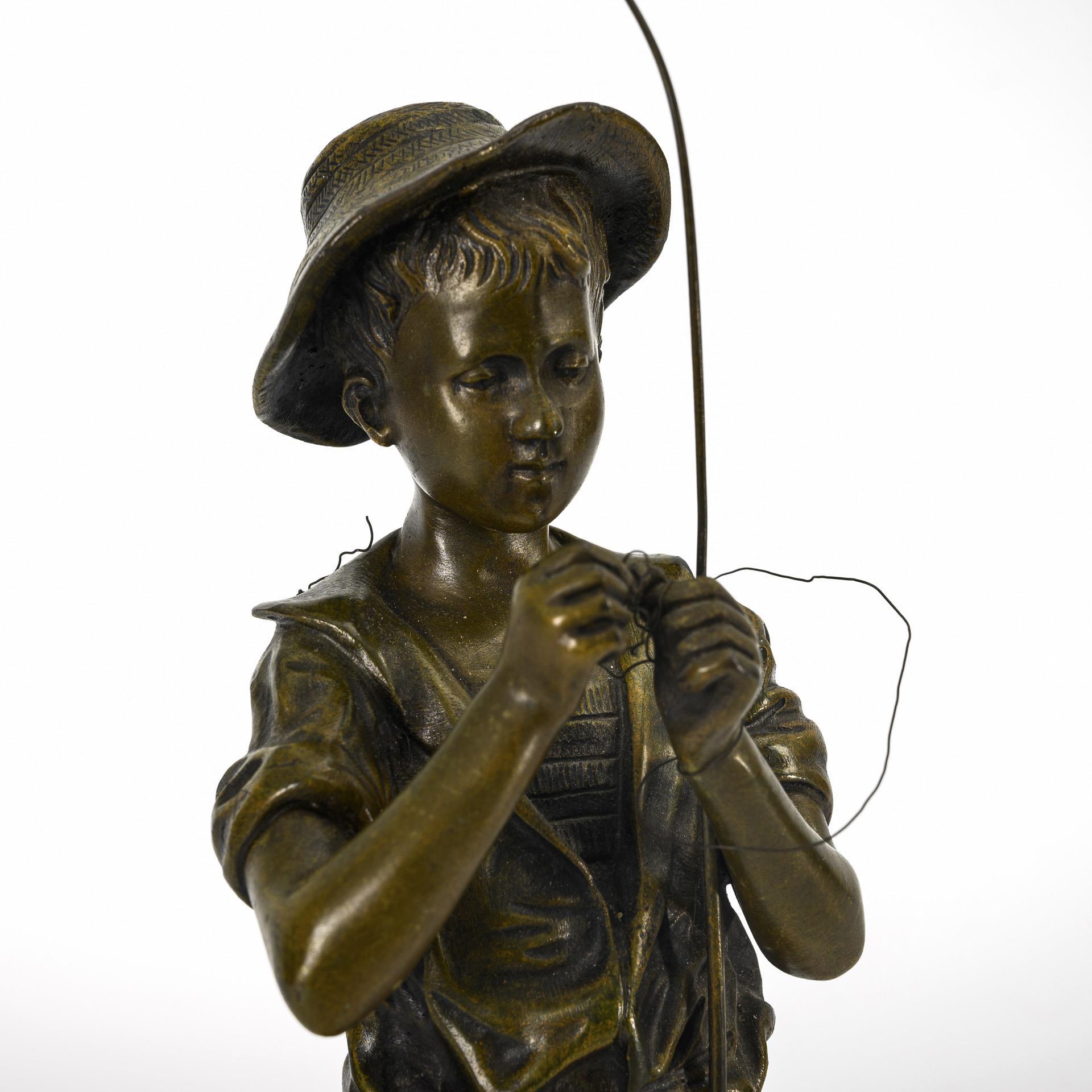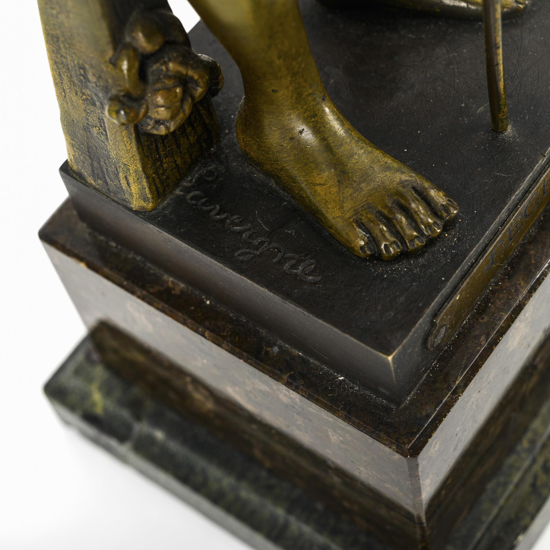 Bronze patiniert, Sockel aus braunem und grünem Serpentin. Bezeichnet, auf der Bronzeplinthe betitelt/bezeichnet: "Pecheur / par Lavergne". H 29,5 / 36,5 cm (ohne Angel). 3,4 kg.