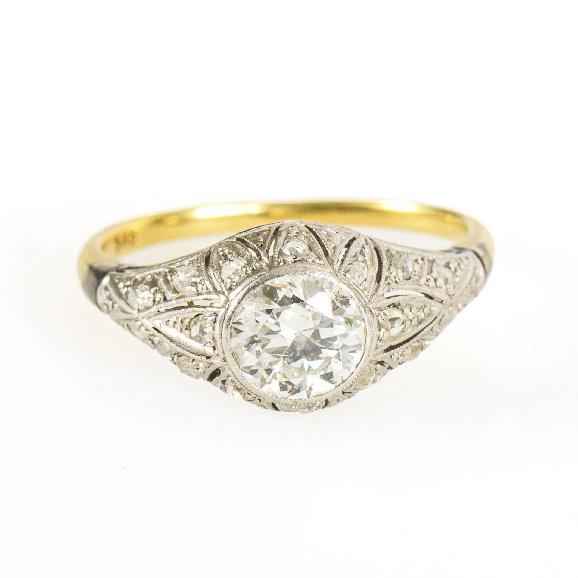 Art déco Ring mit Altschliffbrillant und Diamantrosen.