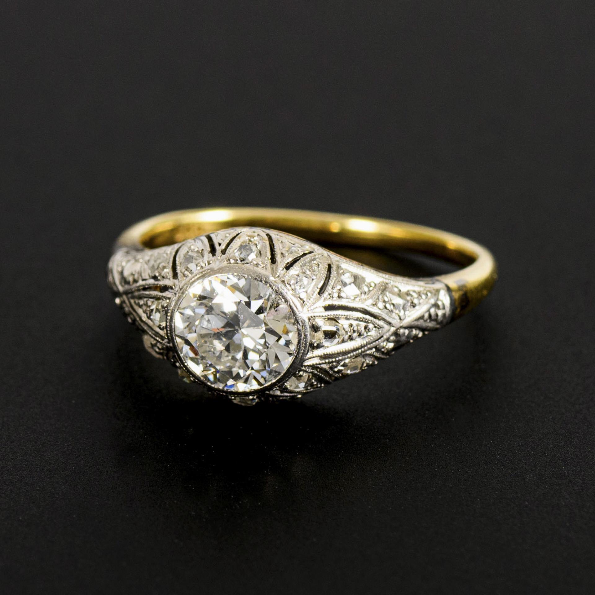 Art déco Ring mit Altschliffbrillant und Diamantrosen.