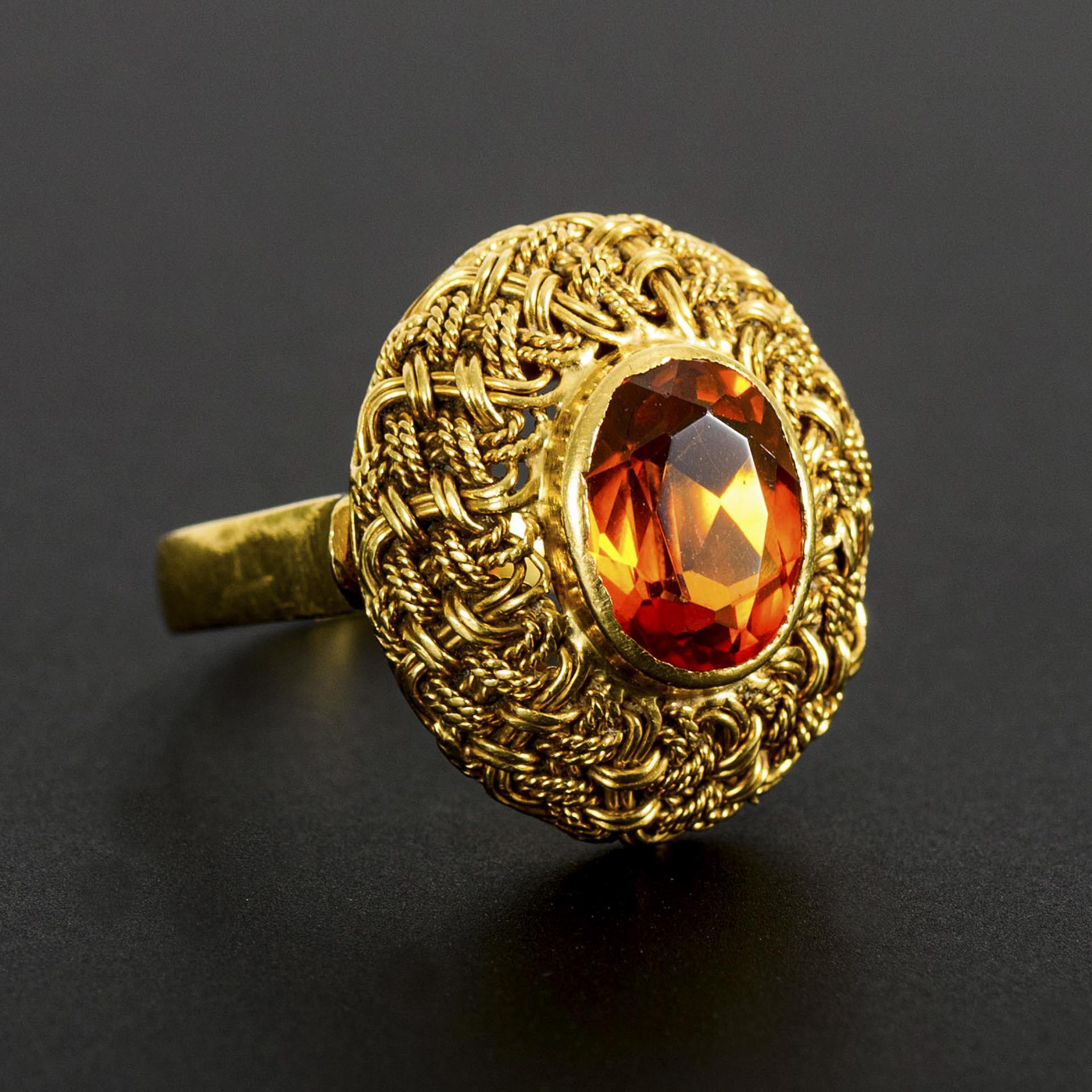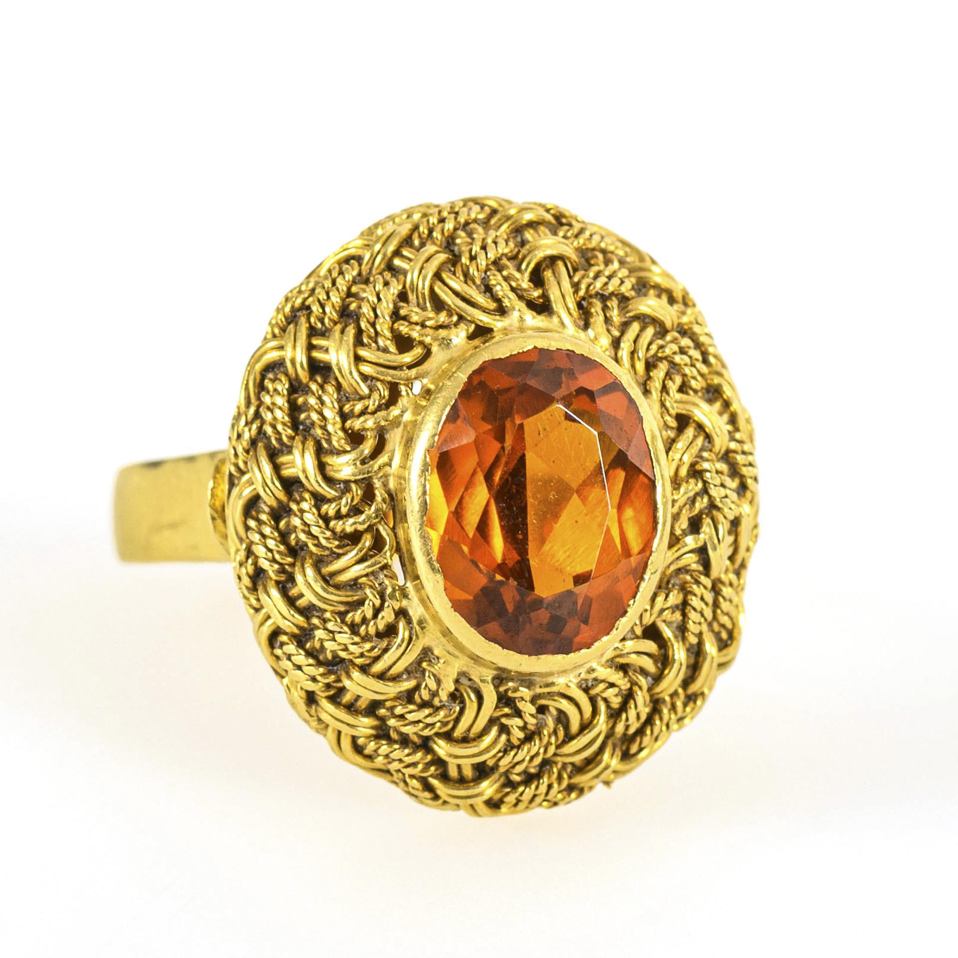 Großer Ringkopf in Zopfmuster-Ausgestaltung mit ovalem Citrin in Zargenfassung auf breiter Schiene. Leichte Tragespuren an der Unterseite.