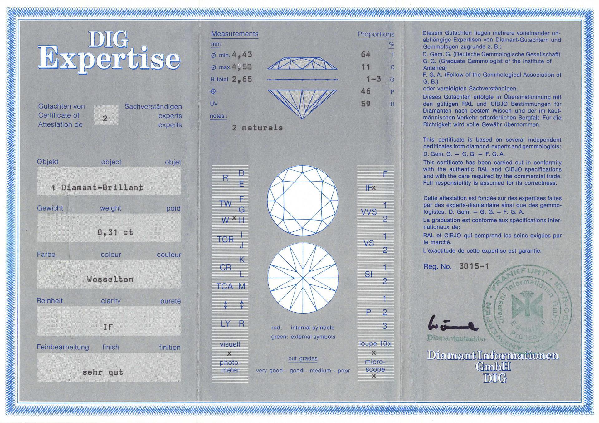 Brillant von 0,31 ct, feines Weiß, IF (frei von inneren Merkmalen) und Feinbearbeitung sehr gut. In Kunststoffhülle plombiert. Zertifikat Registrier-Nr. 3015-1 von: Diamant Informationen GmbH (DIG) Frankfurt a Main.