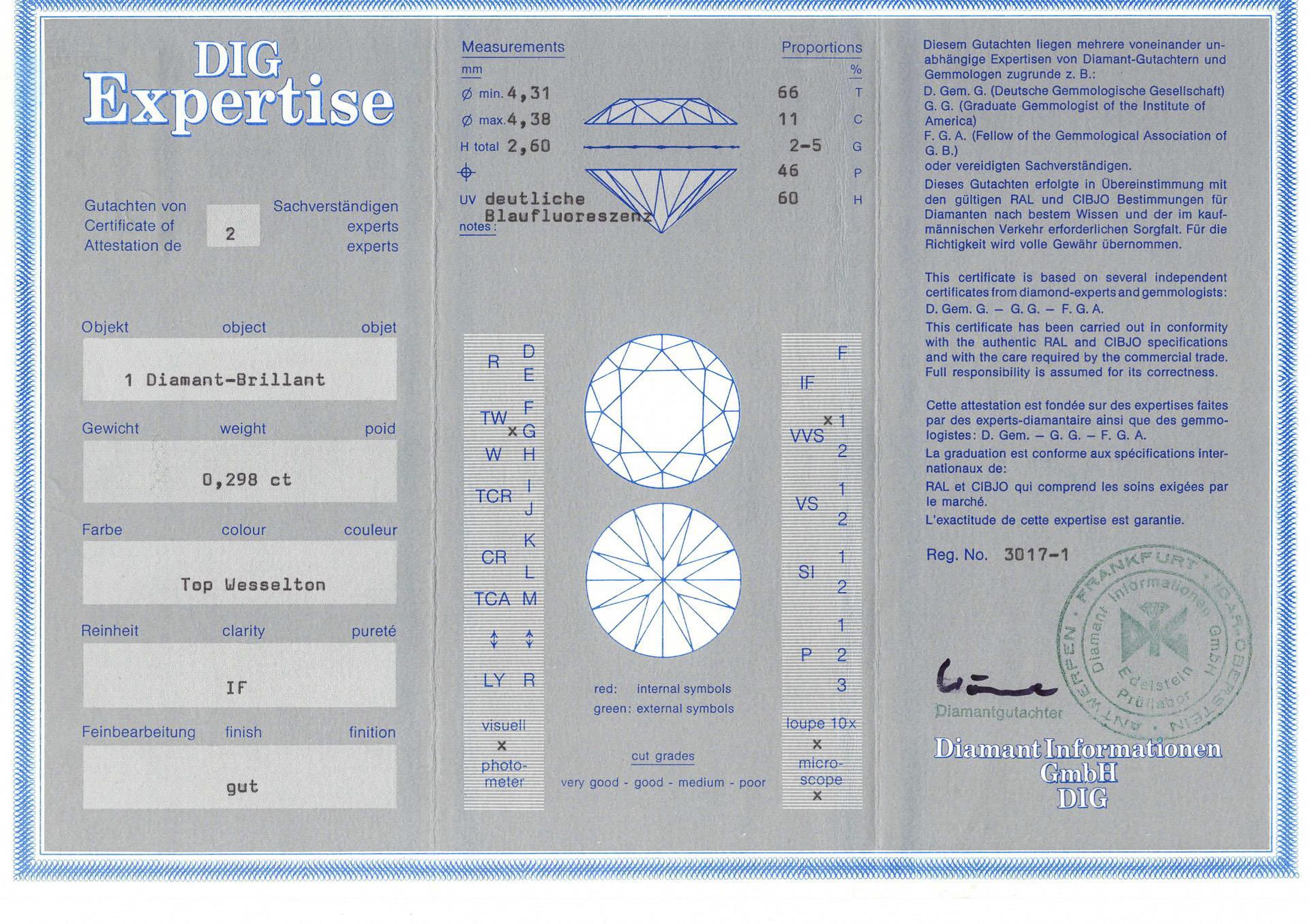 Brillant von 0,298 ct, Feines Weiß, IF (frei von inneren Merkmalen), Feinbearbeitung gut. In Kunststoffhülle plombiert. Expertise Registrier-Nr. 3017-1 von: Diamant Informationen GmbH (DIG) Frankfurt a Main.