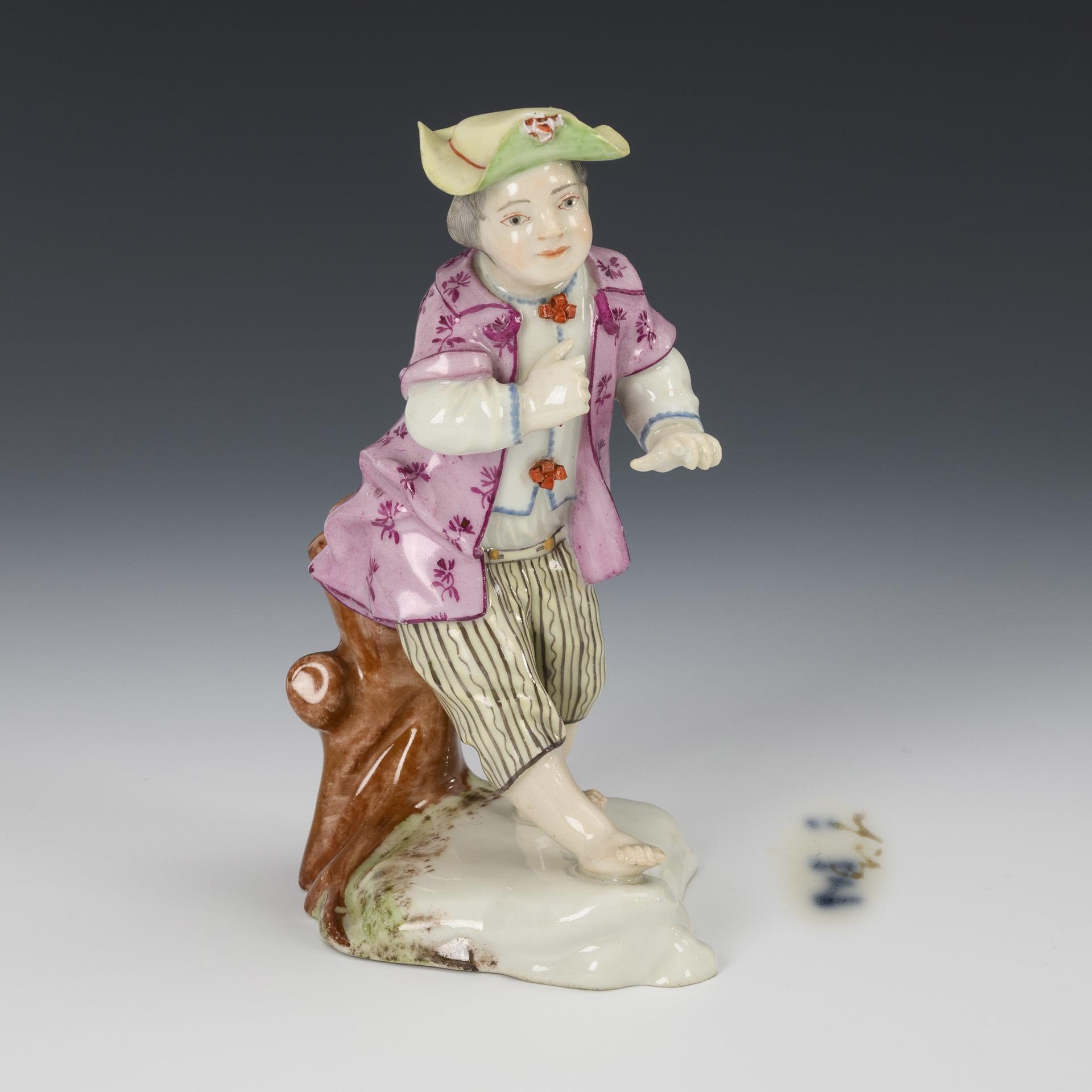 An einem Baumstumpf stehender Knabe. Beide Zeigefinger und Hutschleife bestoßen, je 1 minimale Bestoßung am Hutrand und der Rockkante.