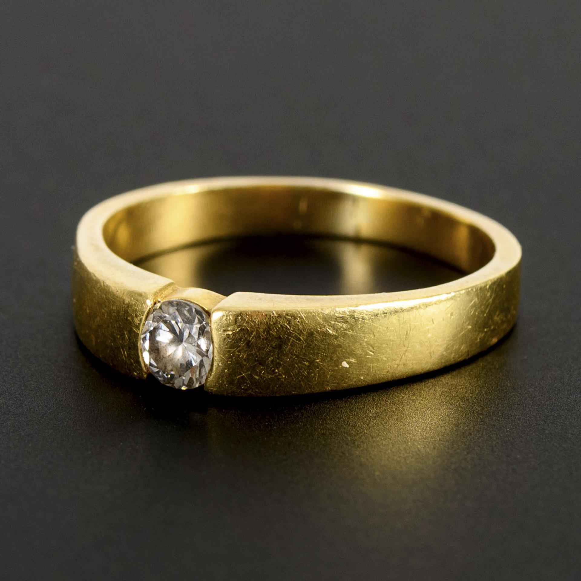Zargengefasster Brillant in massiver Gelbgoldschiene. Tragespuren an Ringschulter und -schiene.