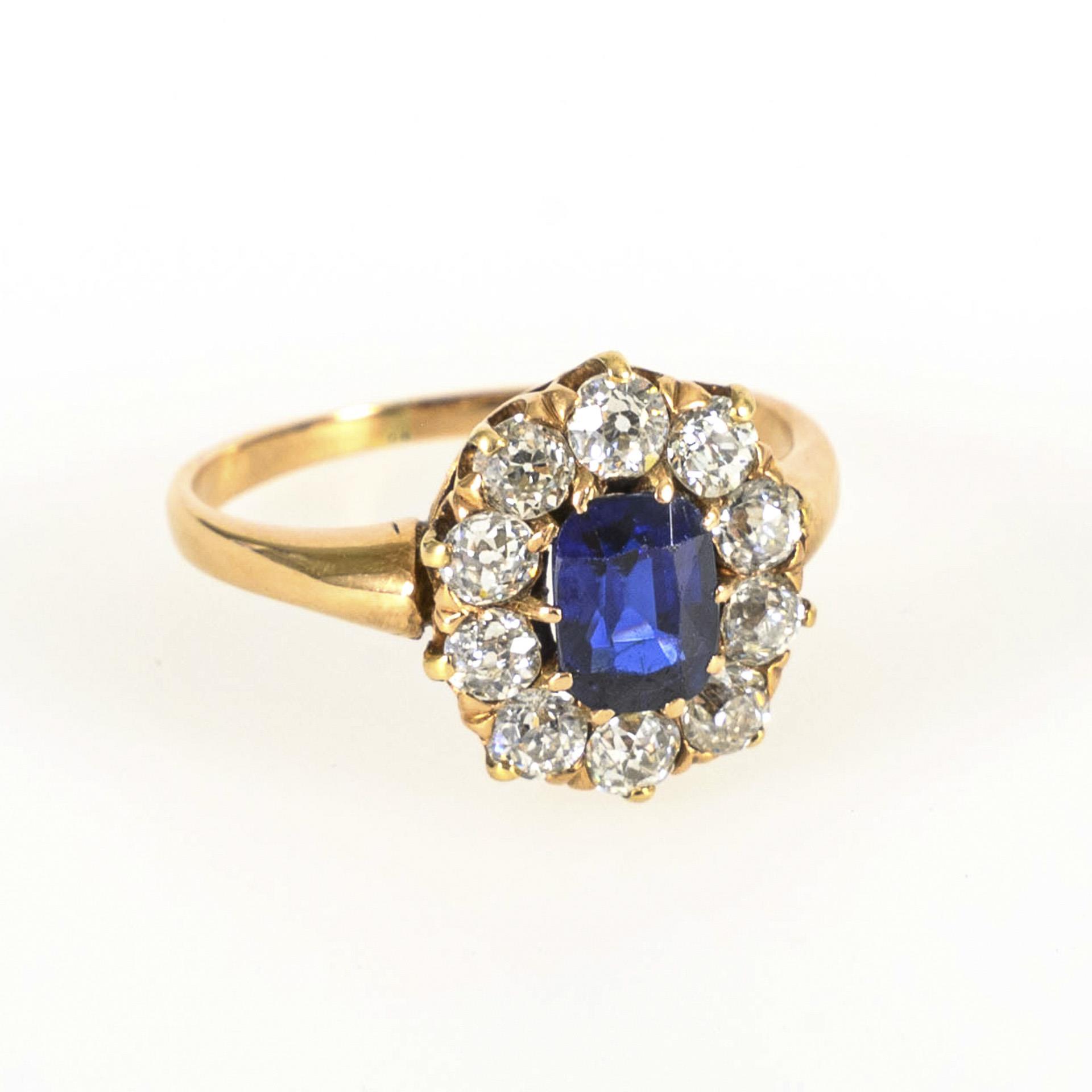 Chatongefasster Saphir, umgeben von Brillanten, auf zarter Schiene, nach berühmtem Vorbild gefertigt. Saphir: Facettenkanten teils berieben, Tafel kleiner Kratzer.