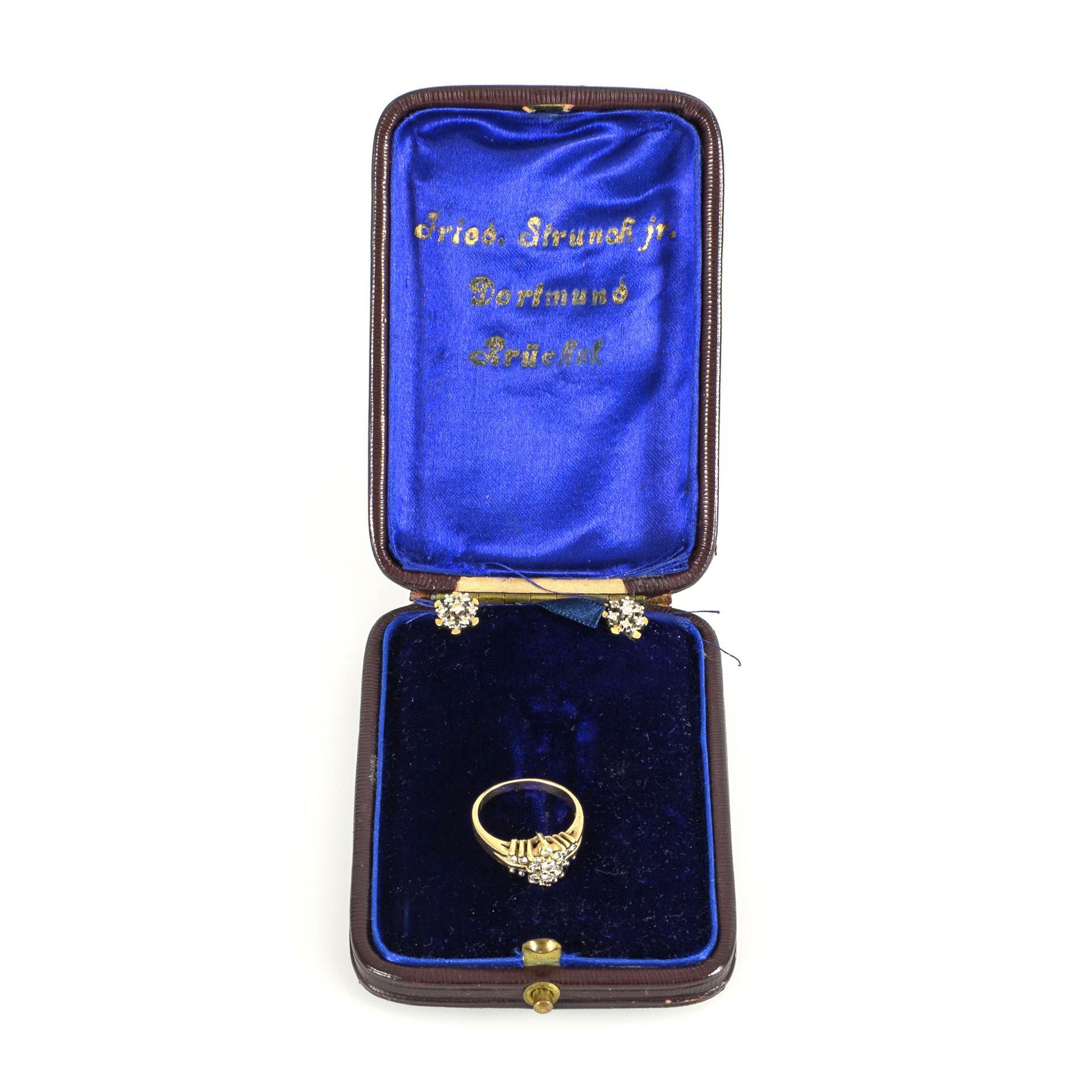 Ring und Ohrsteckerpaar mit Brillanten in älterem Etui.