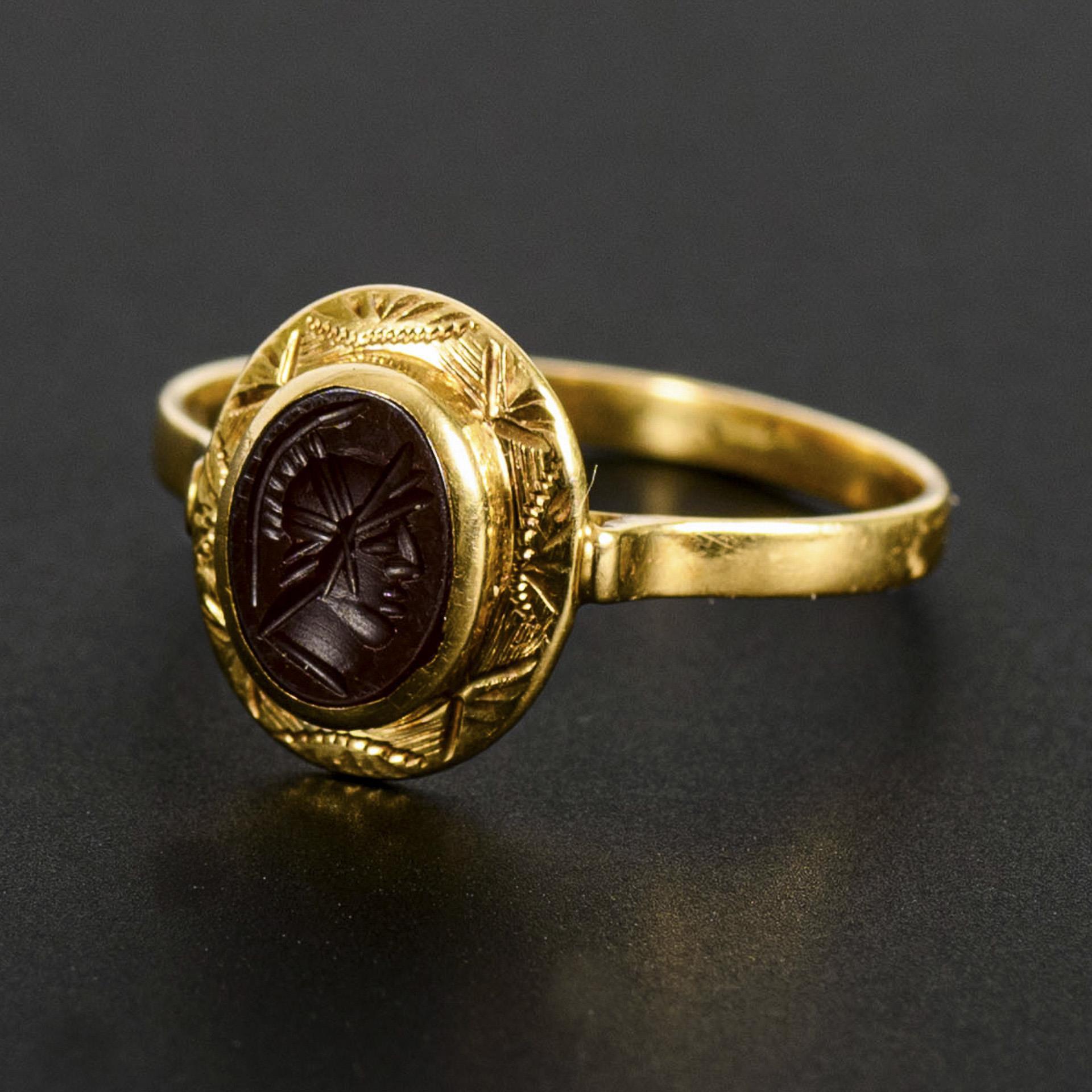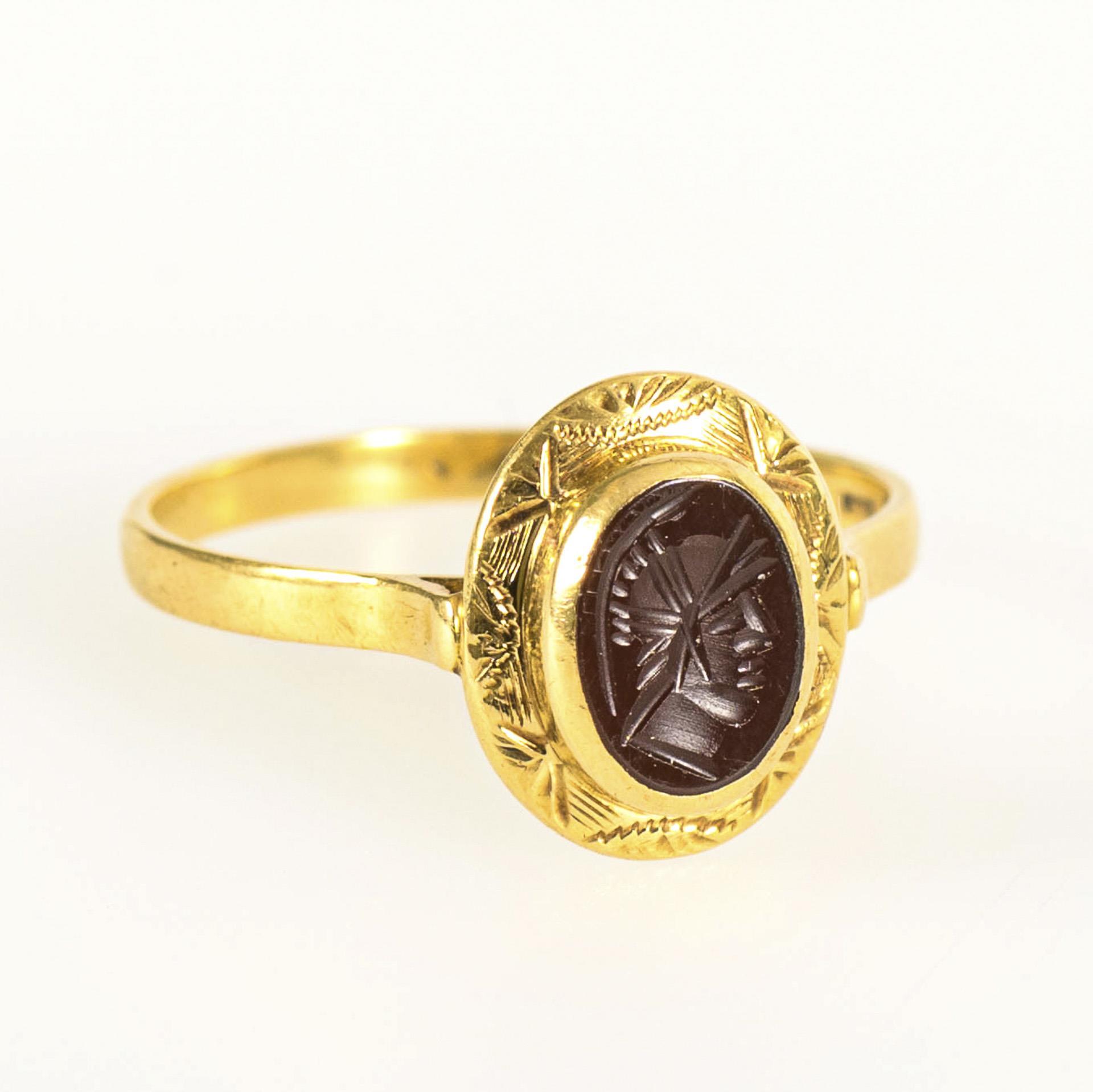 Stein mit antikisierend geschnittenem Männerkopf-Profil, zargengefasst in verziertem Ringkopf.