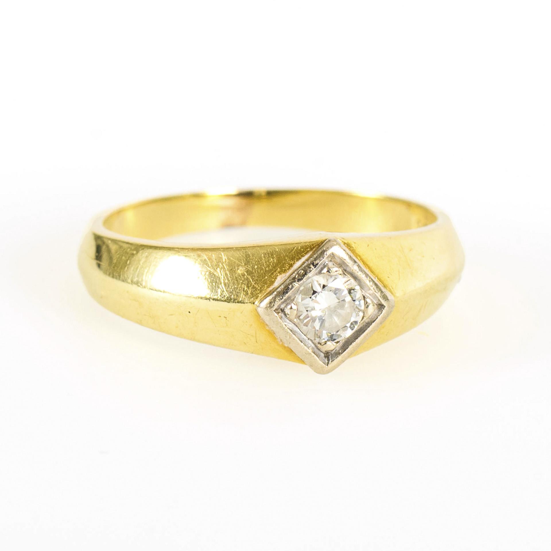 Gelbgold 585 gestempelt, Brillant 0,25 ct gestempelt. Ringgröße 58,5. 5,4 g.