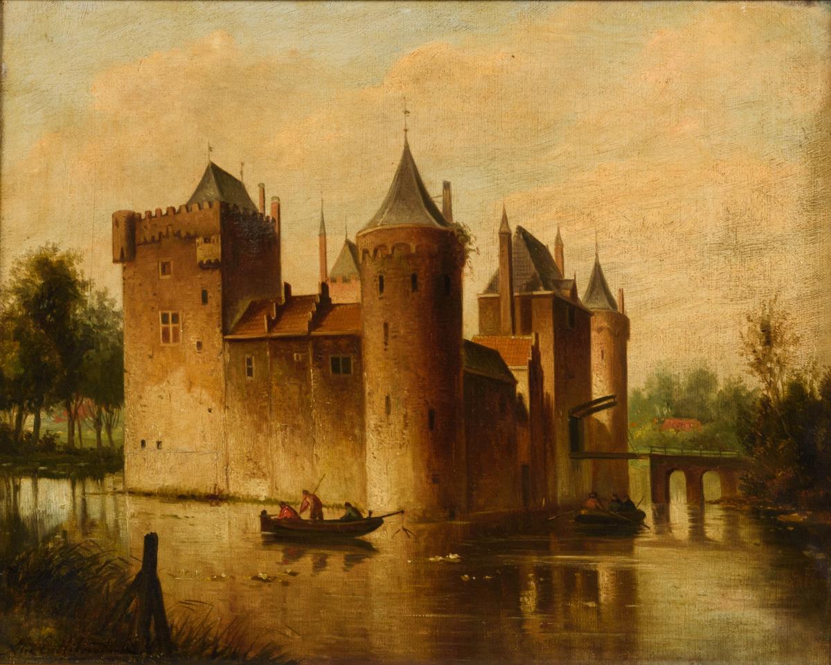 Angler auf dem See nahe dem Schloss unter heiterem Himmel. Leichte Altersspuren.