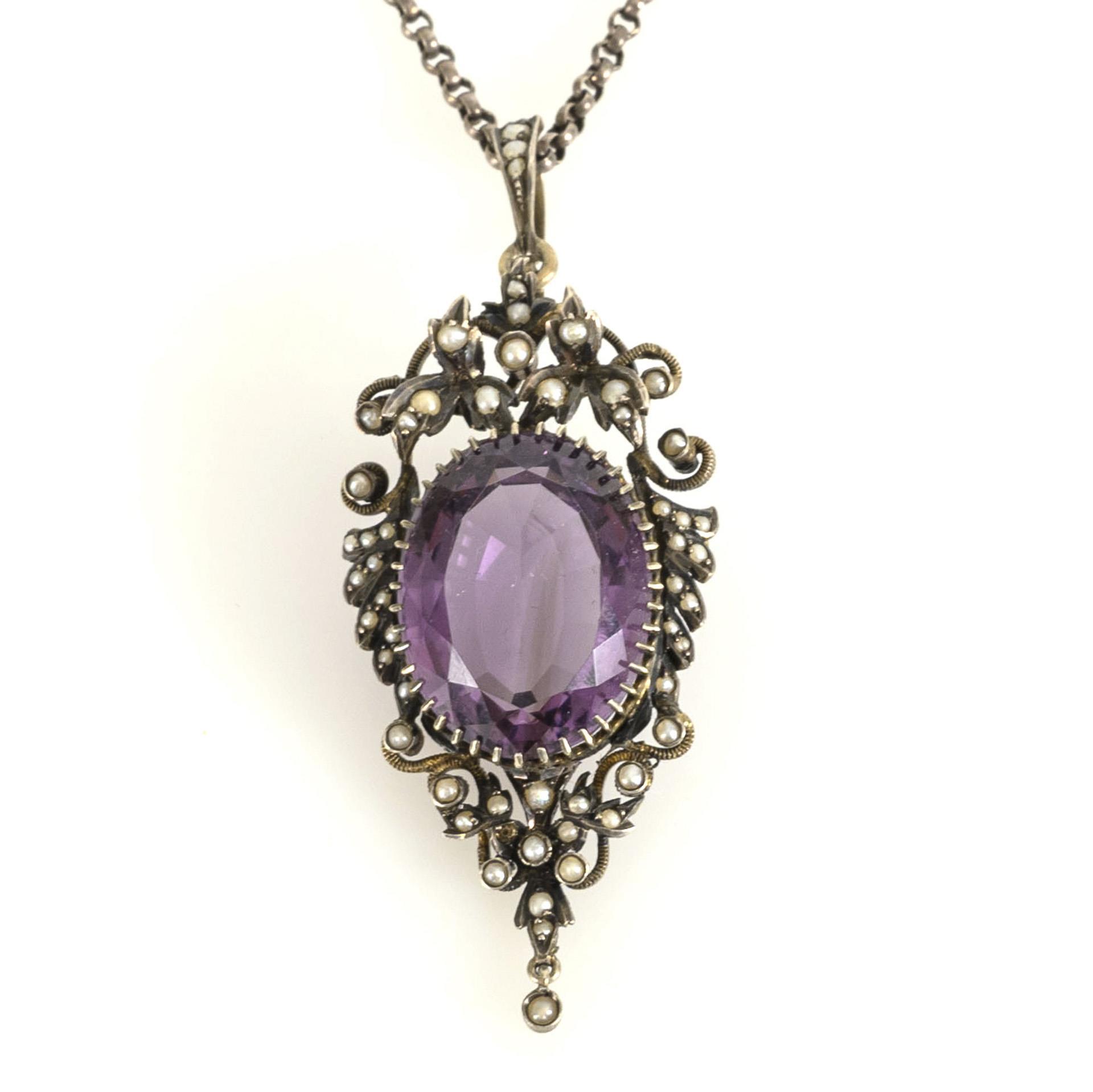 Großer Ornamentanhänger mit krappengefasstem Amethyst?, umringt von eingelassenen Perlchen. Erbskette mit Ringfederschließe. Broschierung entfernt.