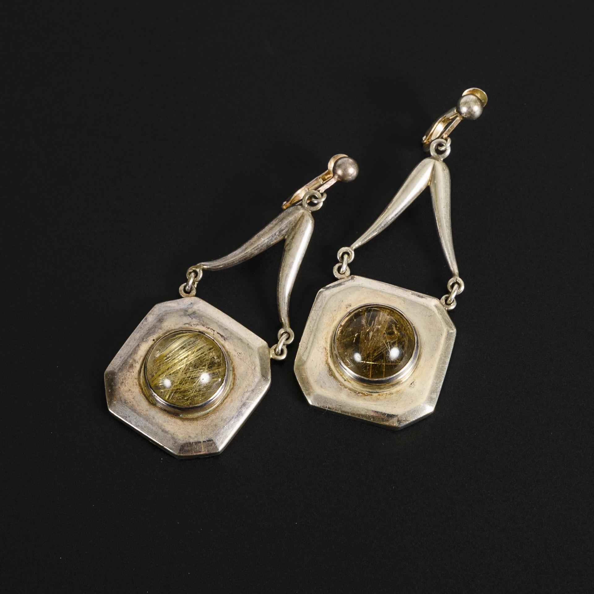 Zargengefasste Rauchquarzcabochons mit Rutilnadeleinschlüssen, auf breitem Rahmen, abgehängt an Klippmechanik.