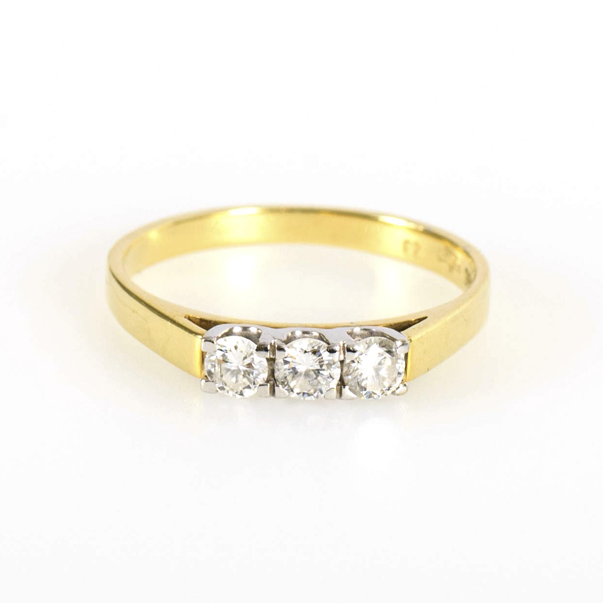Brillant-Trilogiering mit in Weißgold chatongefassten Brillanten an zarter Gelbgoldschiene.