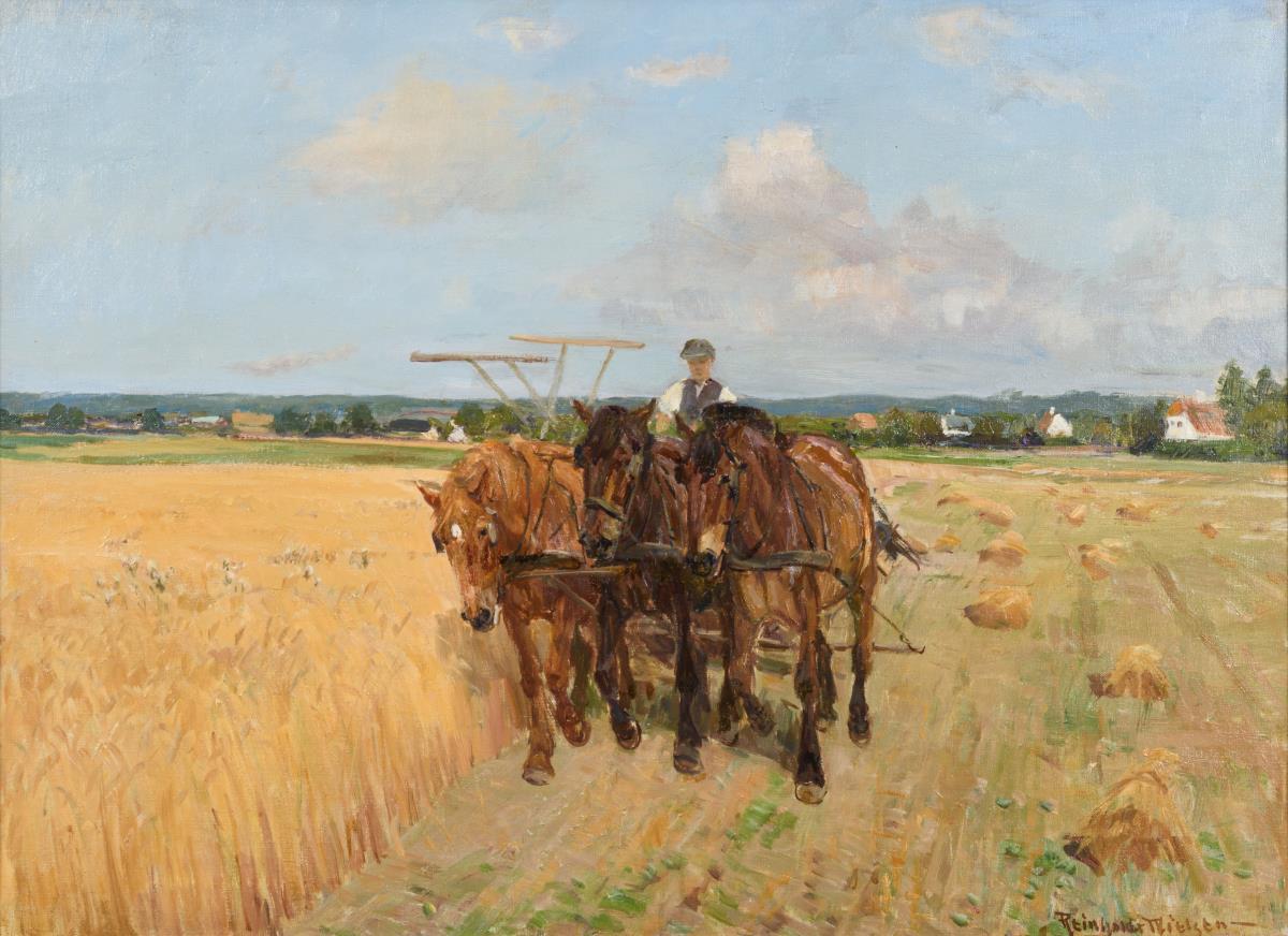 Der Bauer mit den Pferden auf dem Feld bei der Ernte.