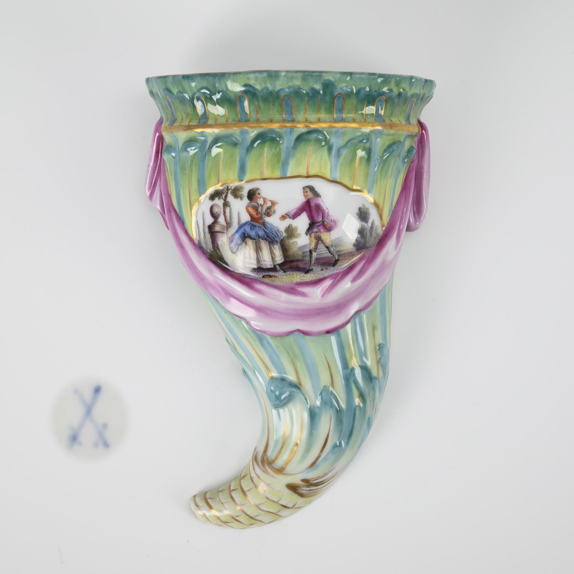 Wandvase in Form eines Füllhorns, in einer spitzovalen Kartusche die Darstellung einer Parklandschaft mit galantem Paar. 1 Randchip.