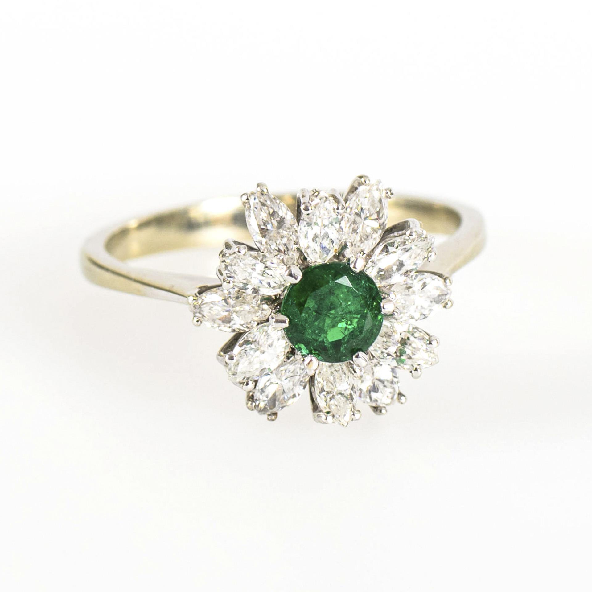 Blütenförmiger Ring mit grünem Stein und Brillanten.