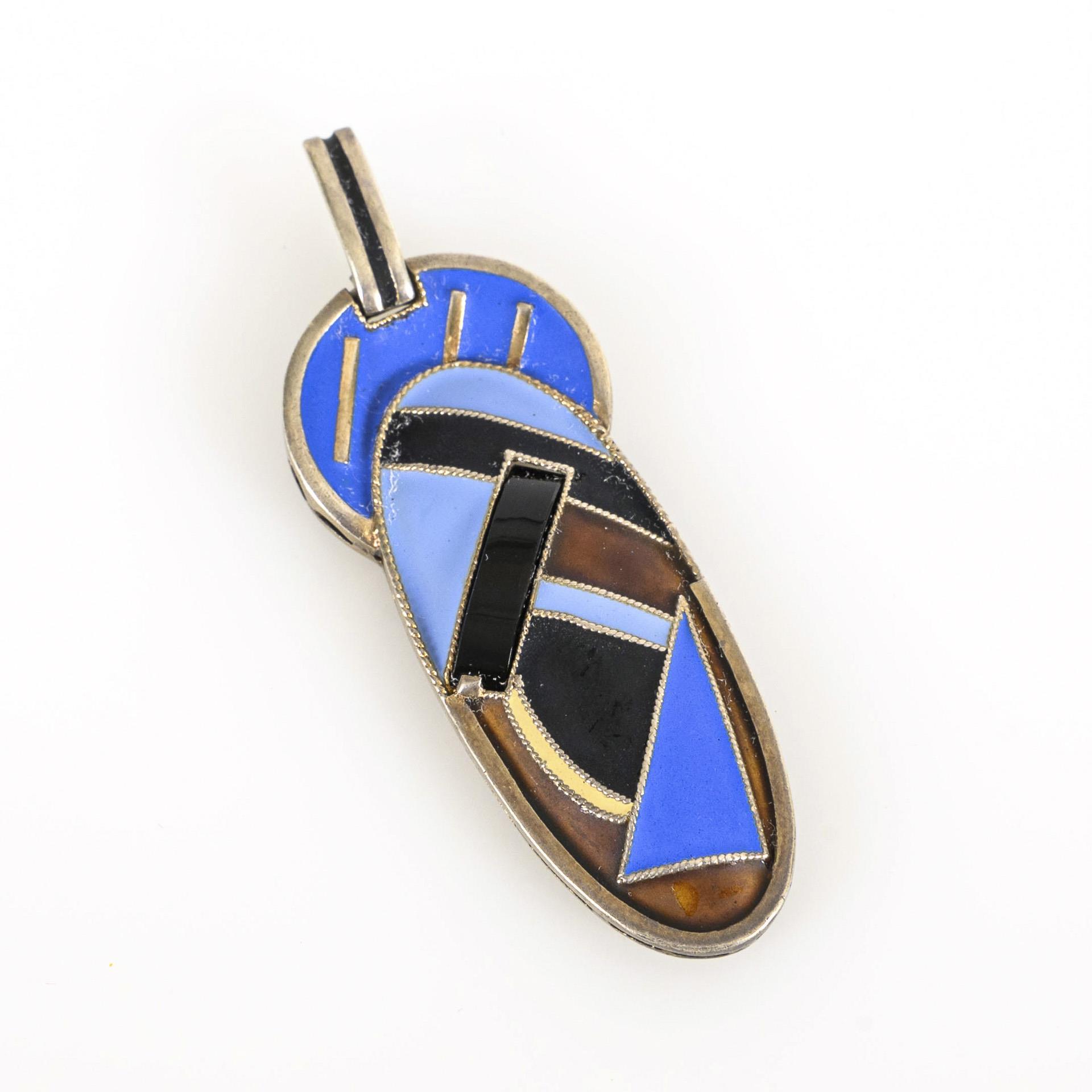 Großer Anhänger mit geometrischen Mattemail-Segmenten, Silberstegen und Kordelrändern.