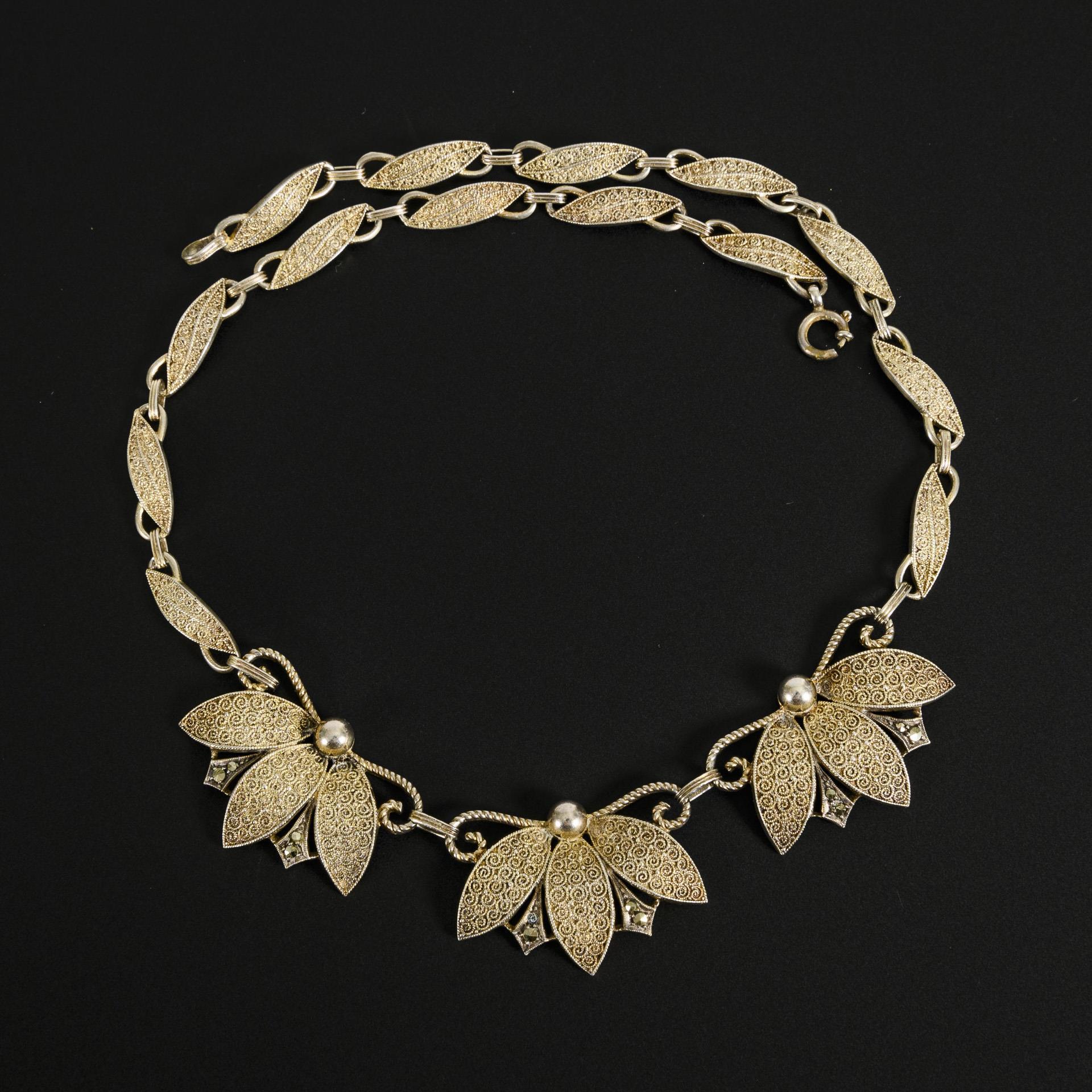 Mittig stilisierte Blütenglieder mit Filigrandrahtbelötung und kleinen Markasiten, zwischen Ziergliederkette, an Ringfederschließe. Ein Markasit fehlt.