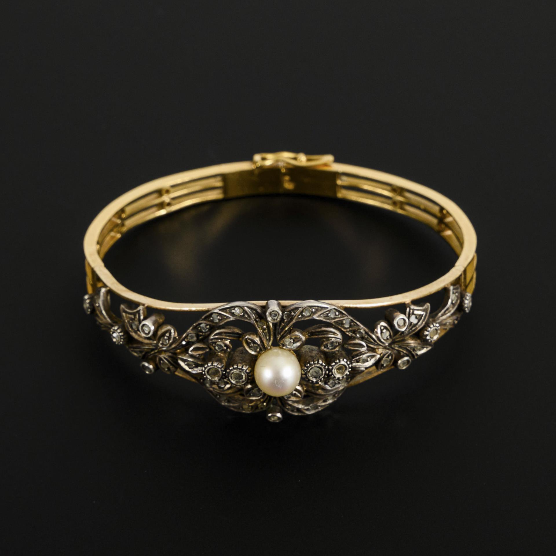 Historisierend gestalteter Armreif in Gelbgold und Silber mit Perle und kleinen Diamantsplittern.