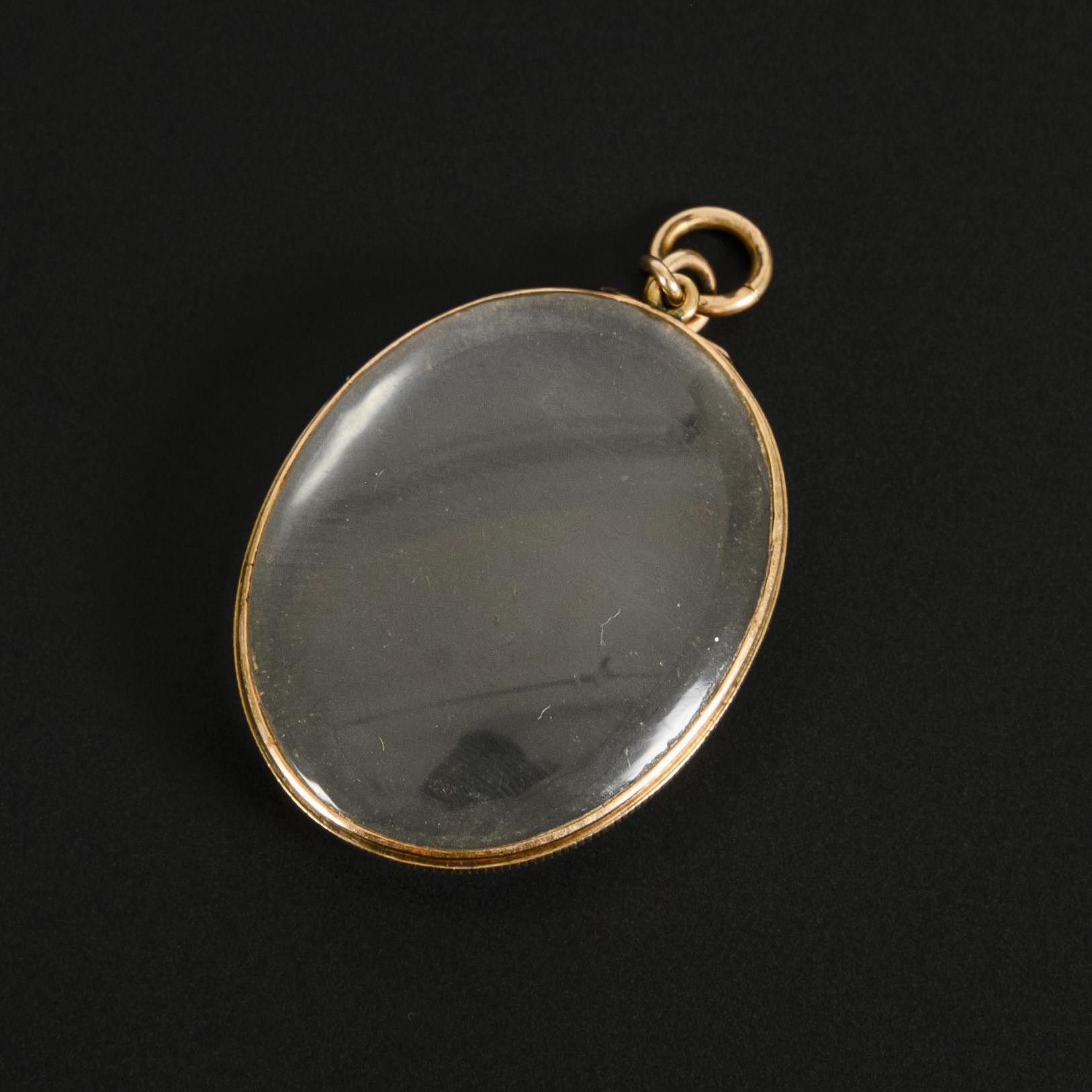 Medaillonanhänger mit beidseitigen Glaseinlagen. Leichte Kratzer auf dem Glas.