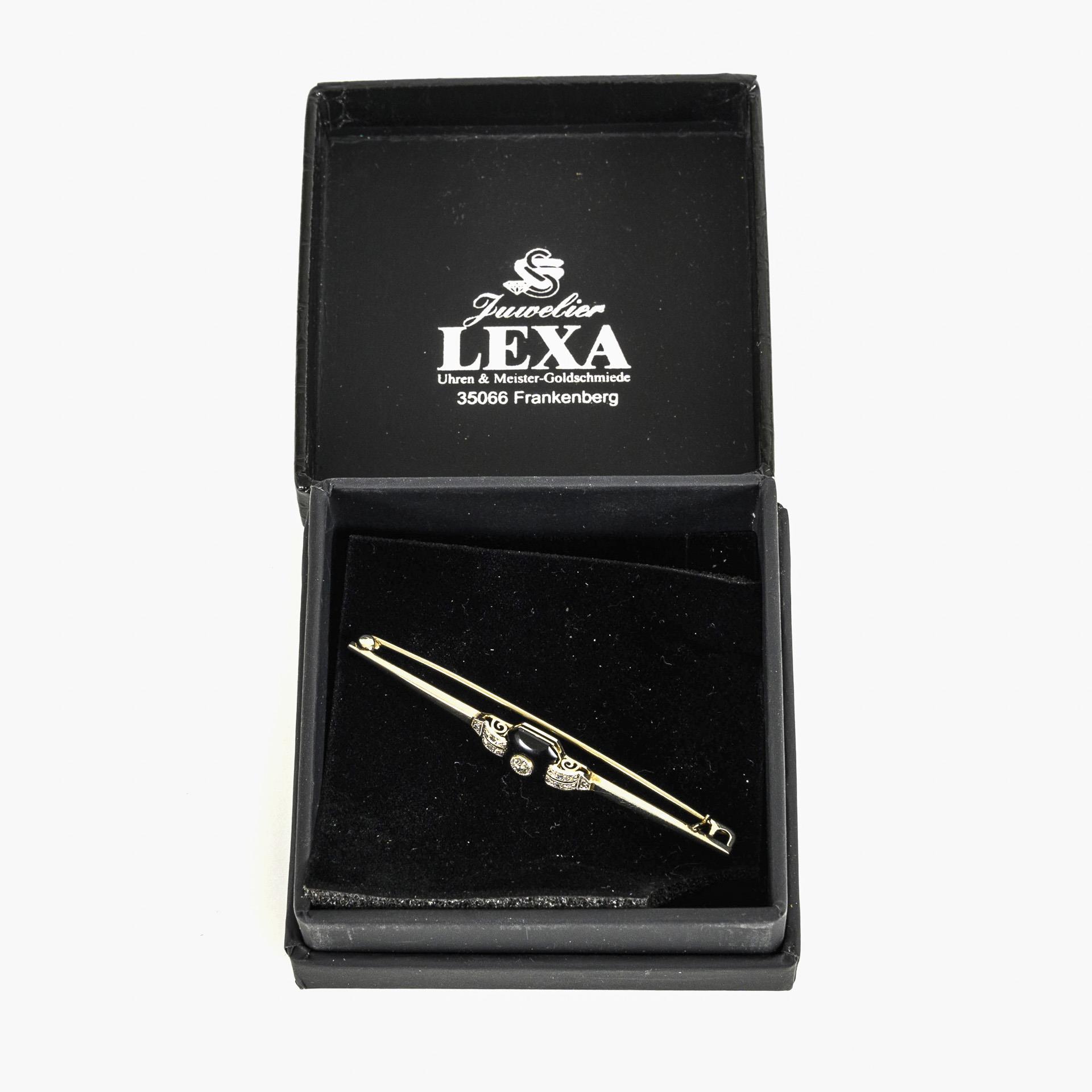 Zargengefasster Altschliffbrillant auf Onyxsegment zwischen Millegriffeszier mit 6 kleinen Diamantrosen. Hakenverschluss mit Kippsicherung.