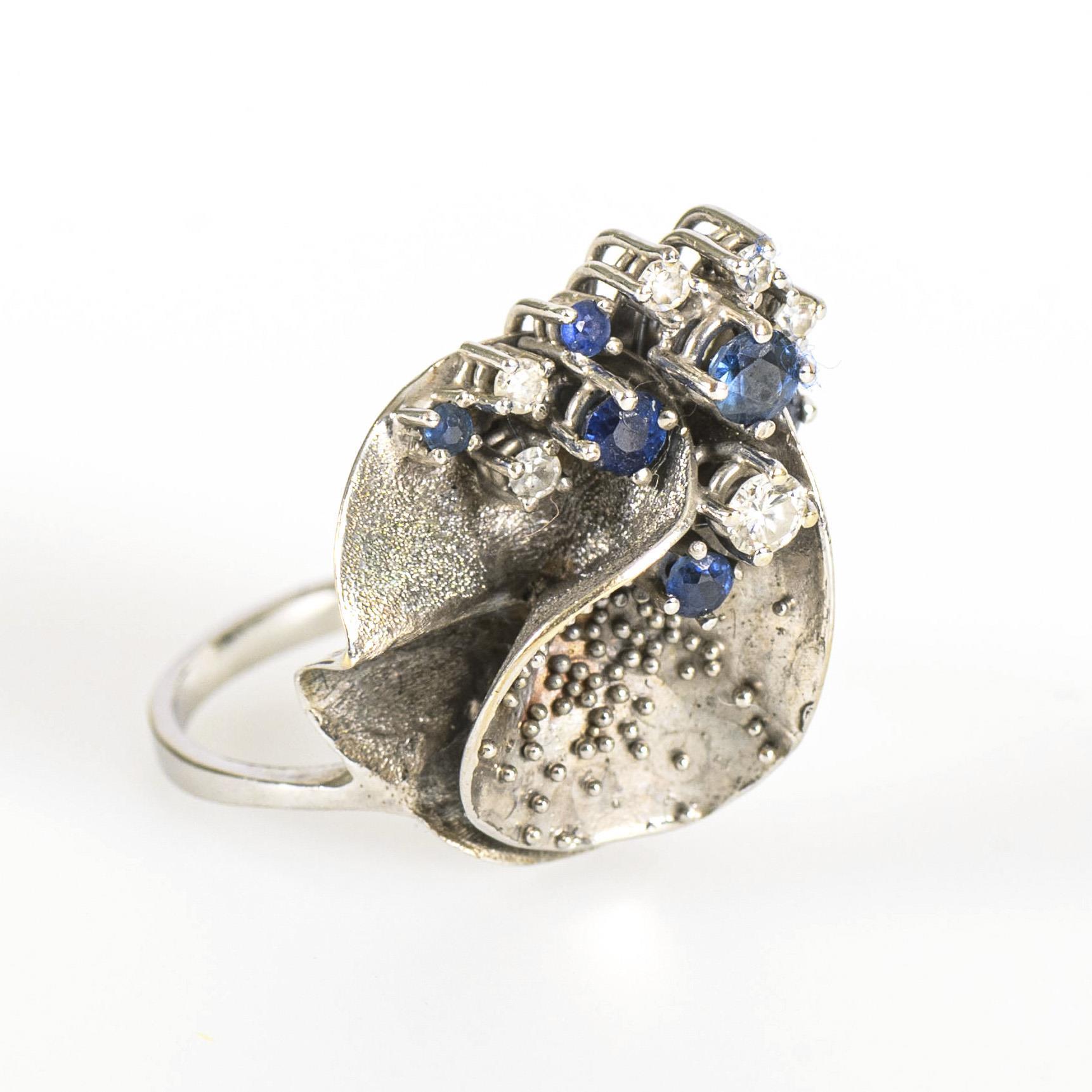 Erhaben gestalteter Designring mit 6 Brillanten und blauen Farbsteinen.