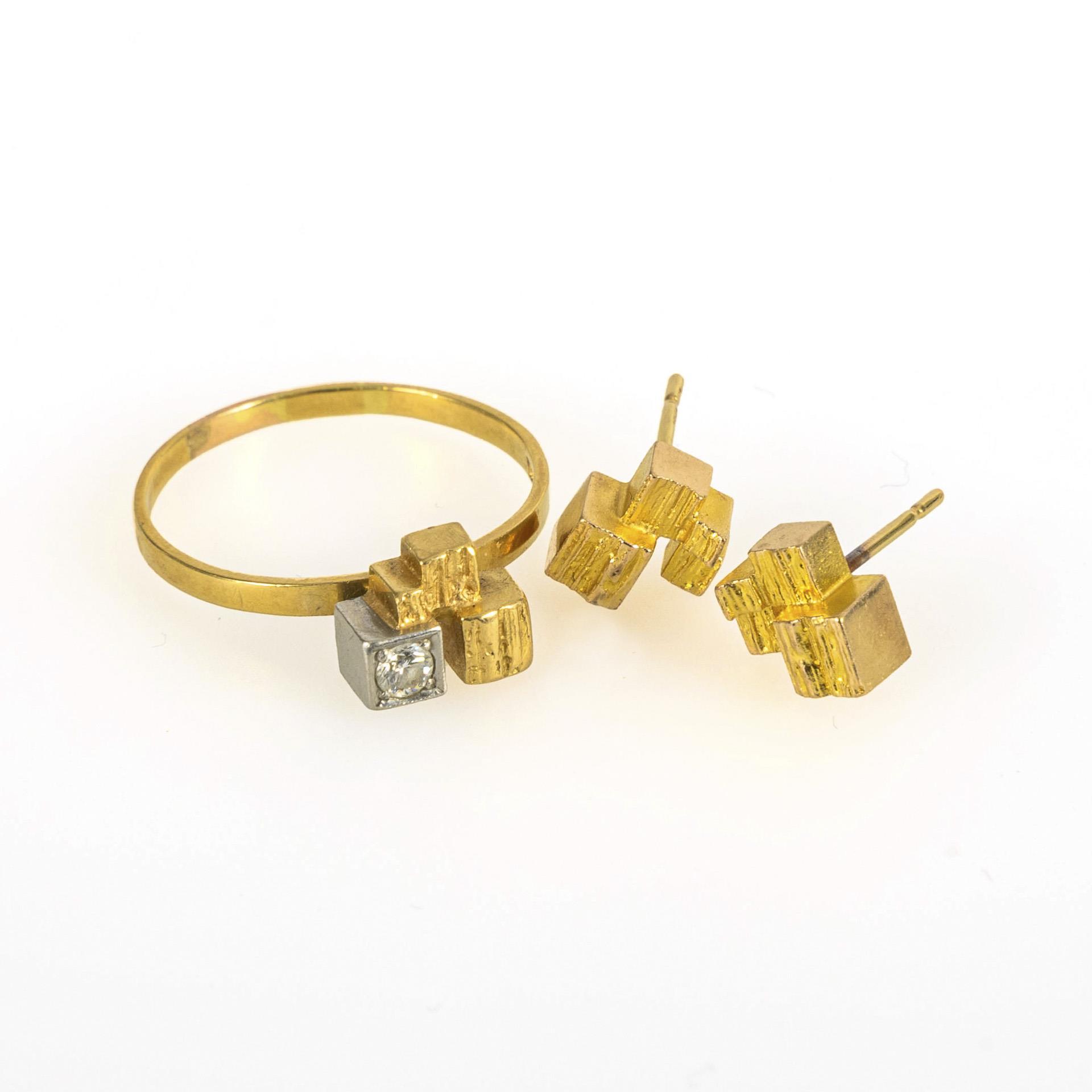 Ring Gelbgold 750 gestempelt; Ohrstecker Gelbgold 333 geprüft. Ringgröße 61; Durchmesser der Ohrringe 0,9 cm. 4,7 g.